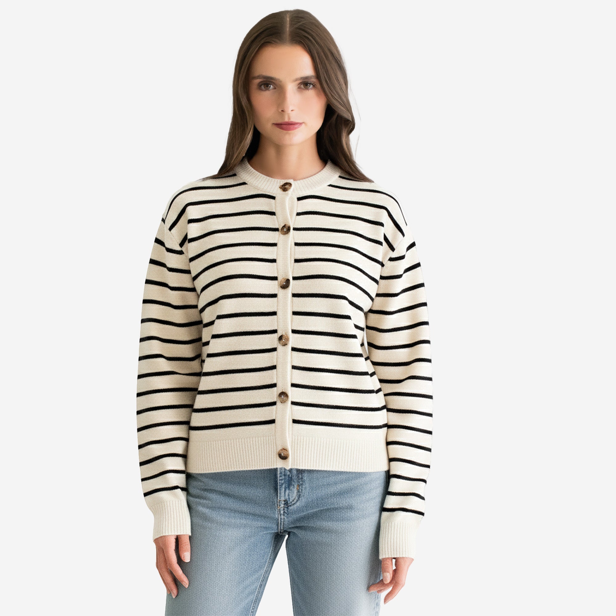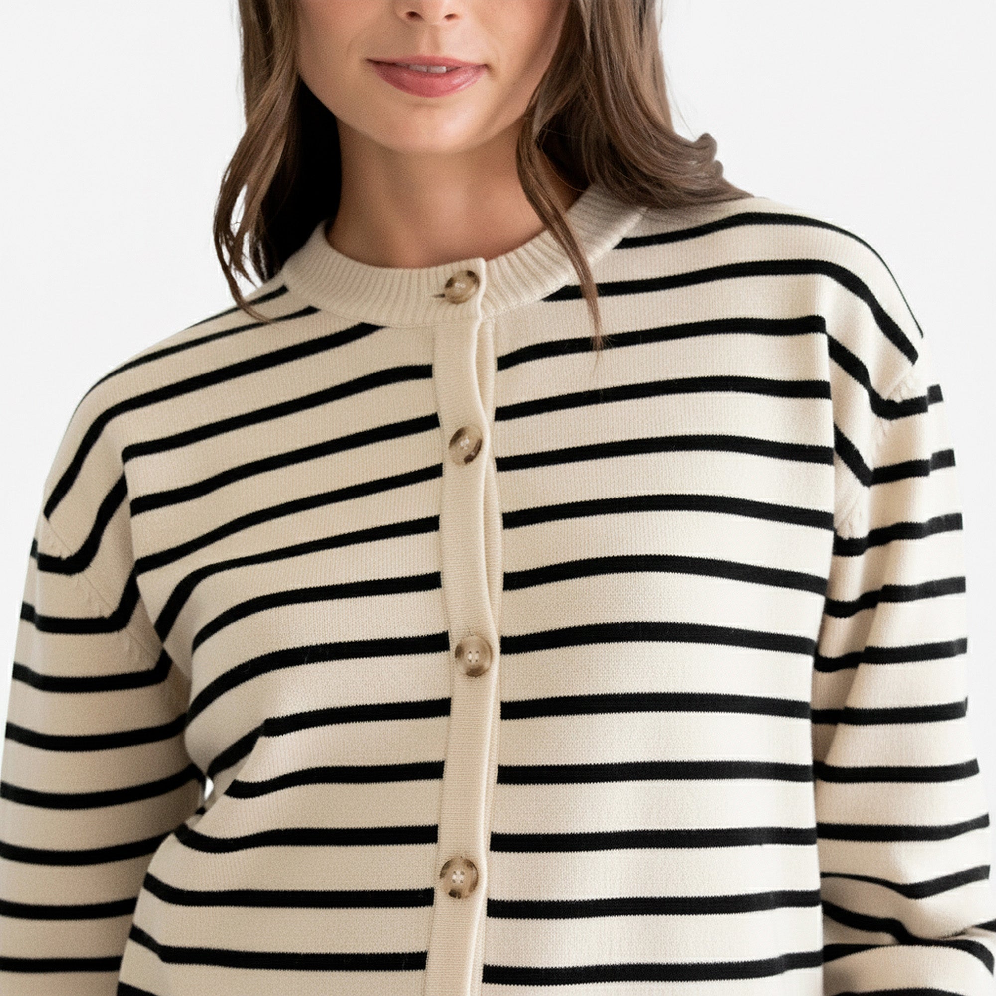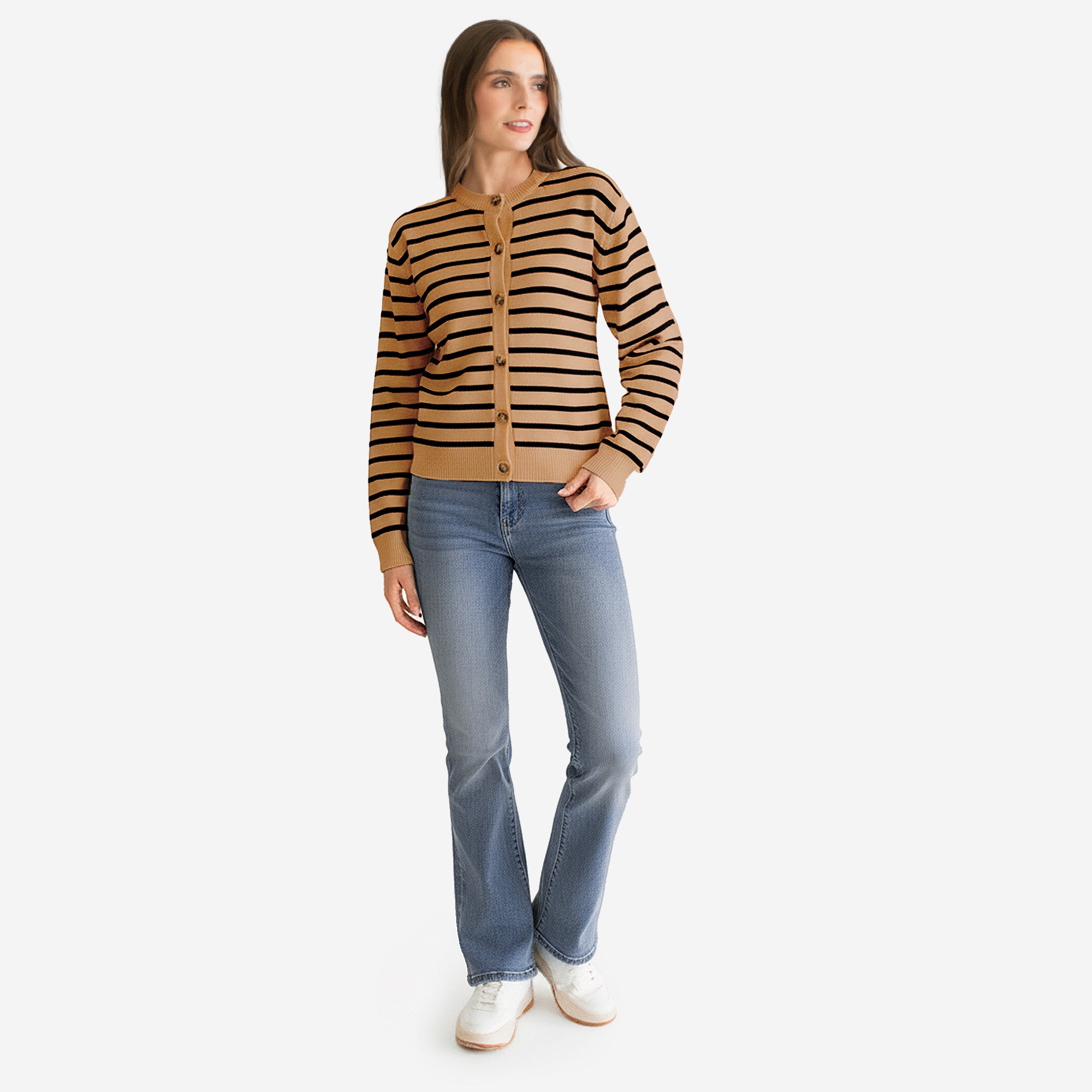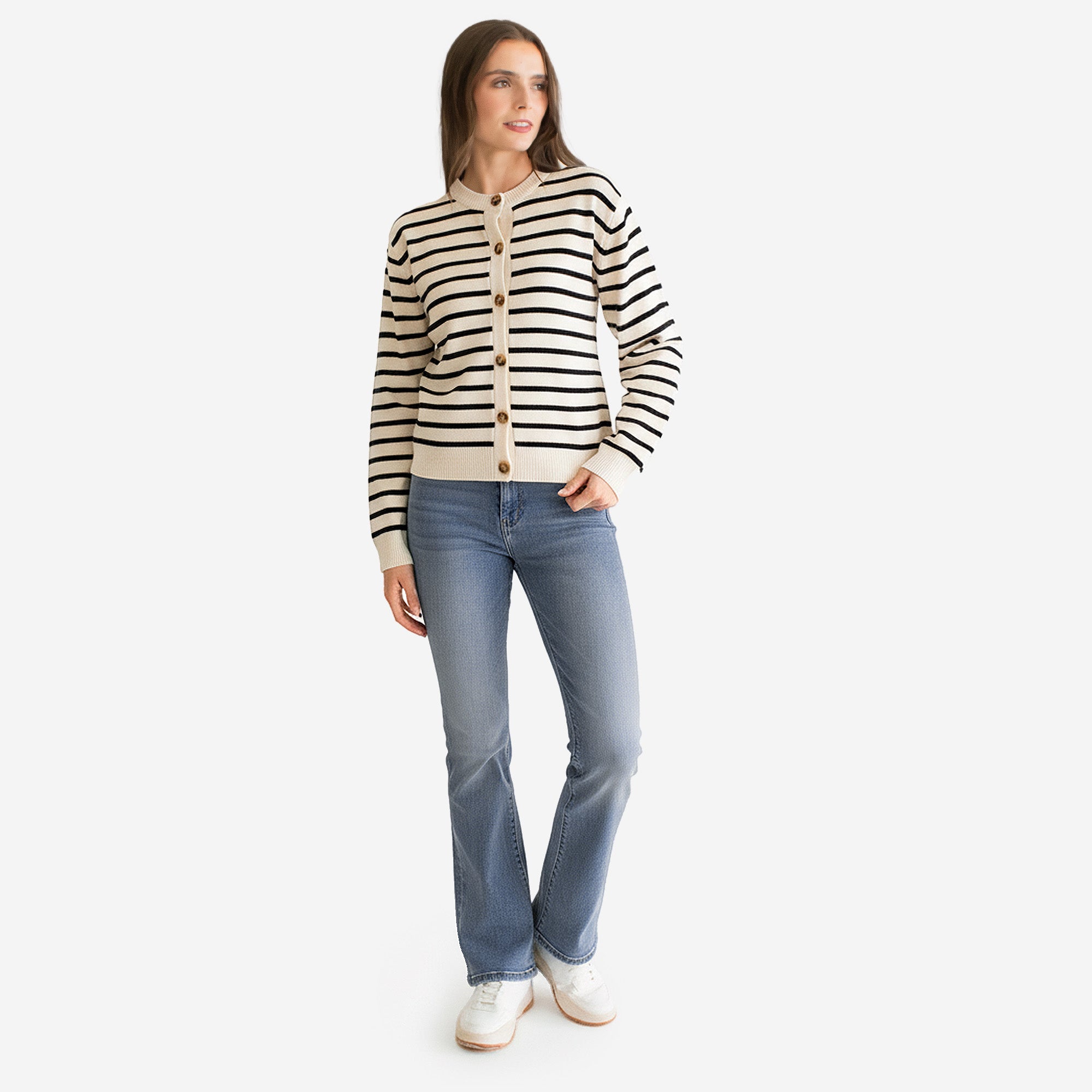 Suéter estampado a rayas para dama en comfy fit, diseñado con botones centrales que aportan un toque moderno y versátil. Una pieza ligera y actual, perfecta para elevar looks casuales.
