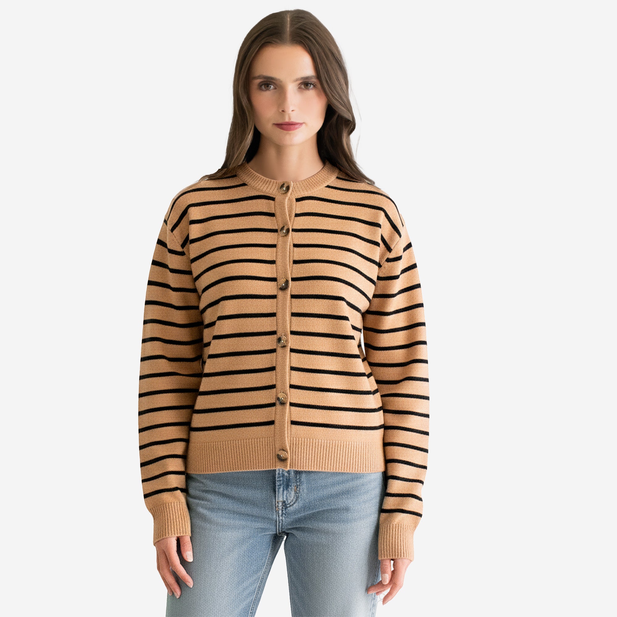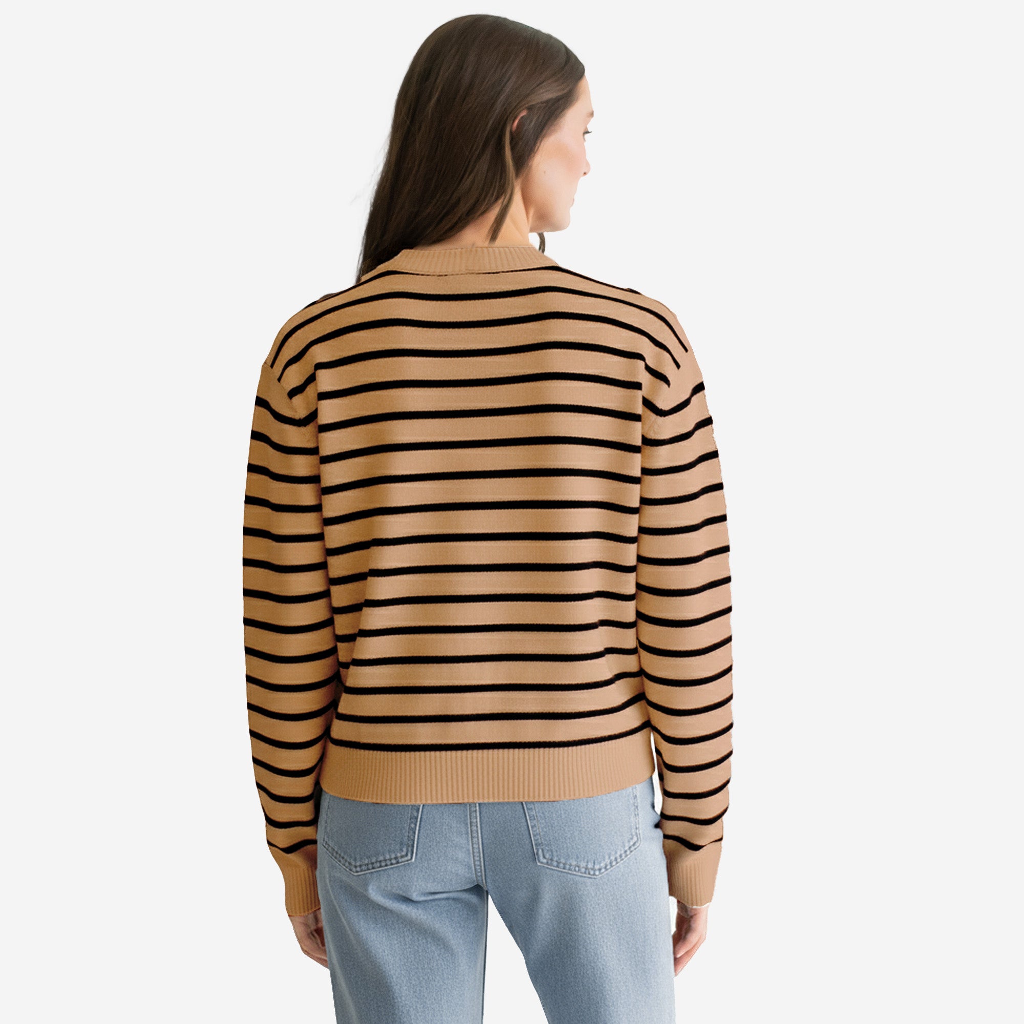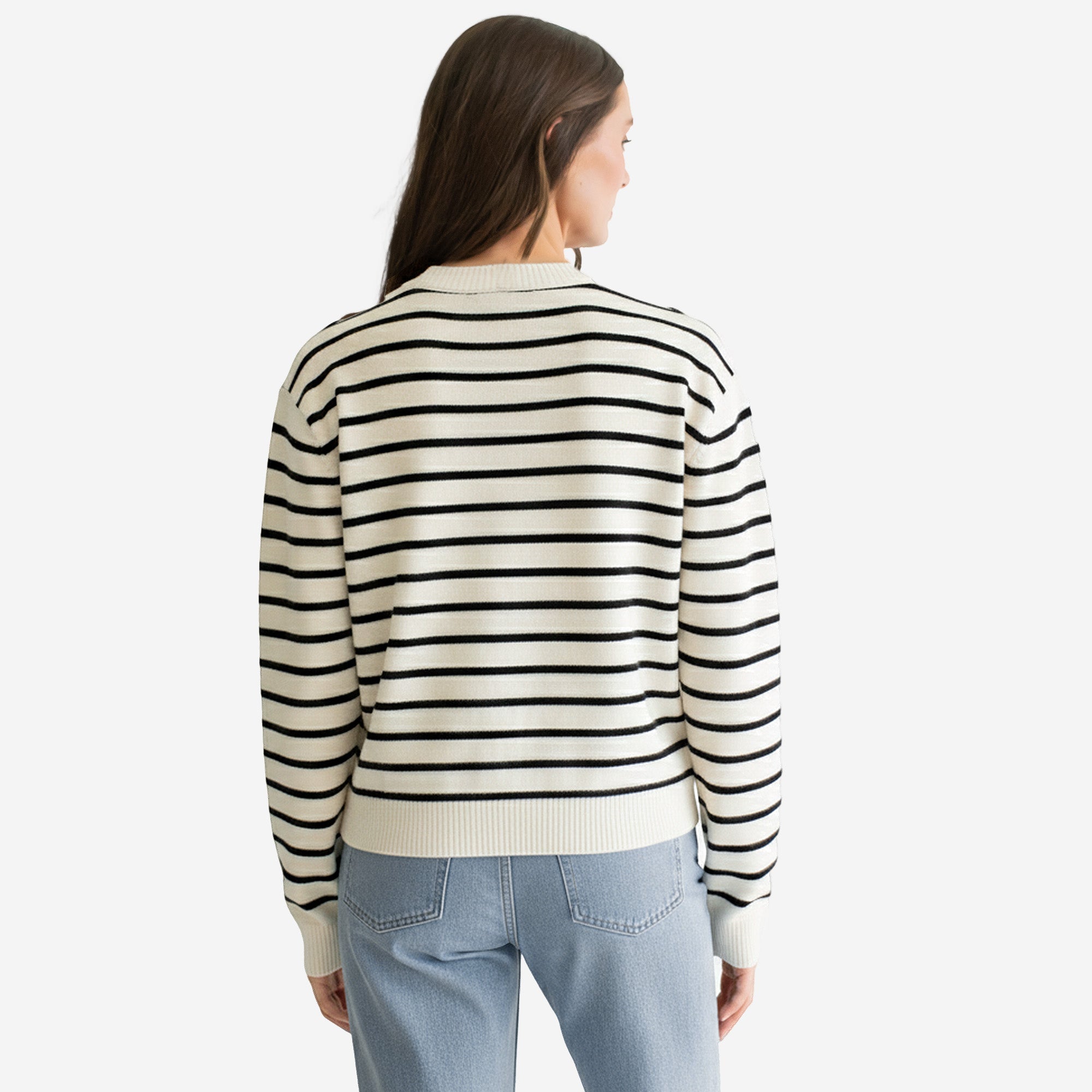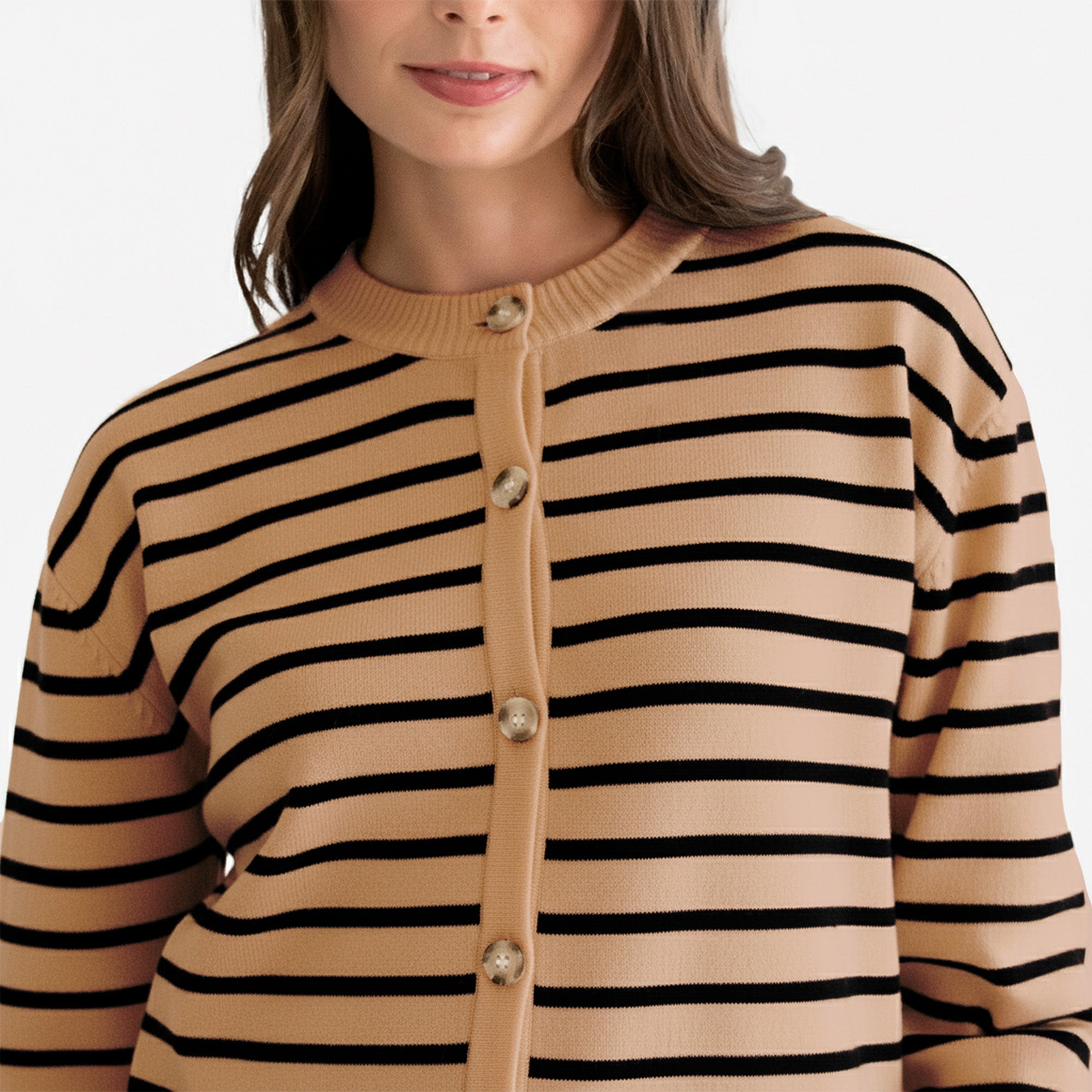 Suéter estampado a rayas para dama en comfy fit, diseñado con botones centrales que aportan un toque moderno y versátil. Una pieza ligera y actual, perfecta para elevar looks casuales.