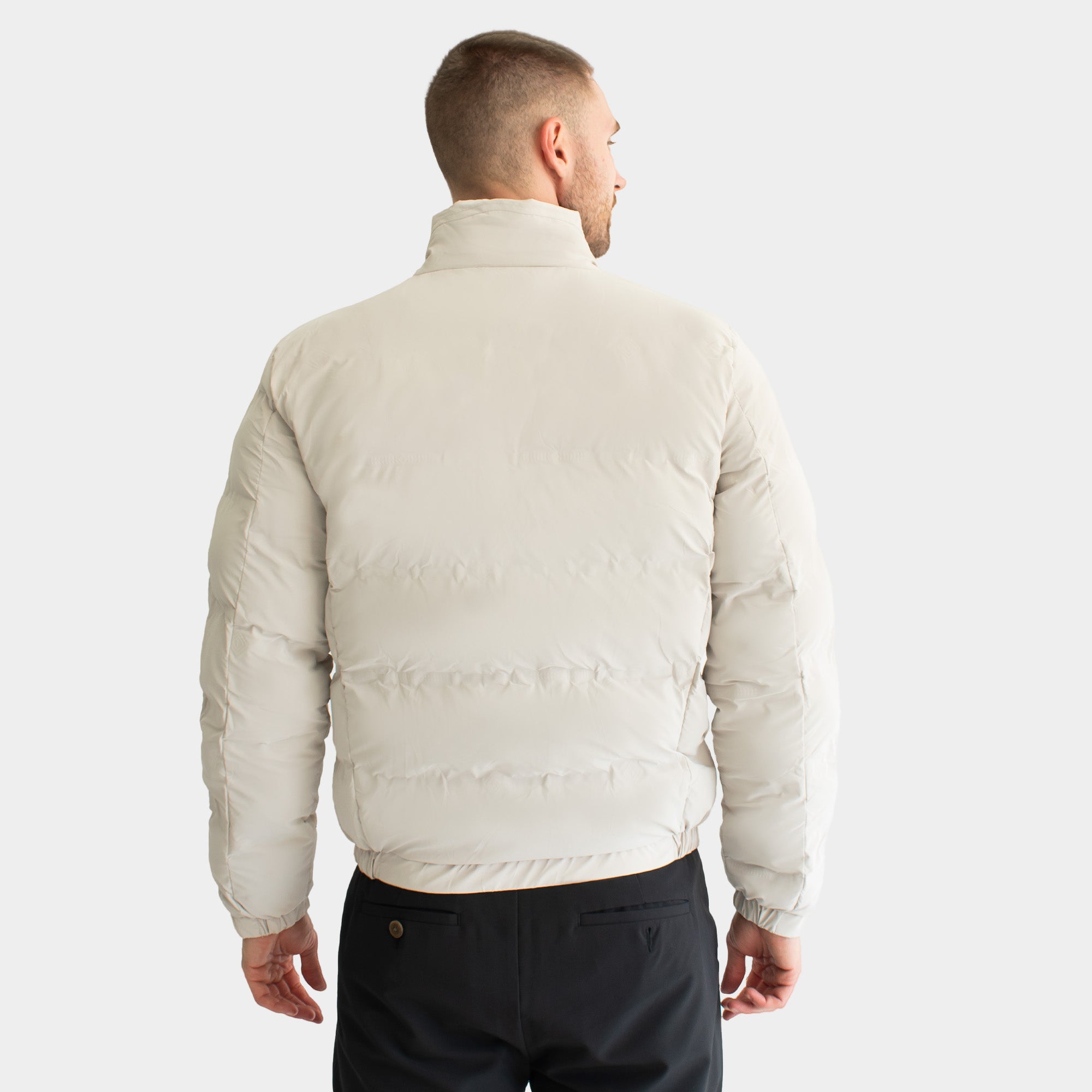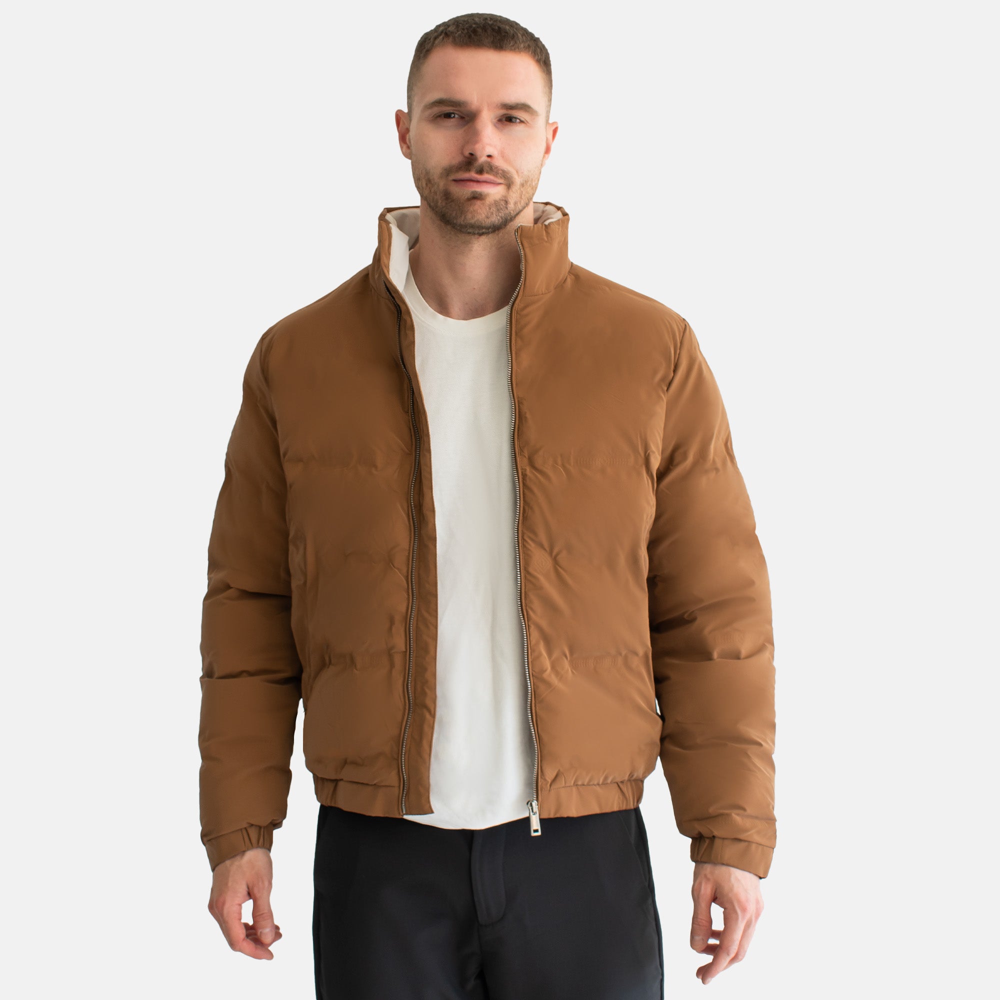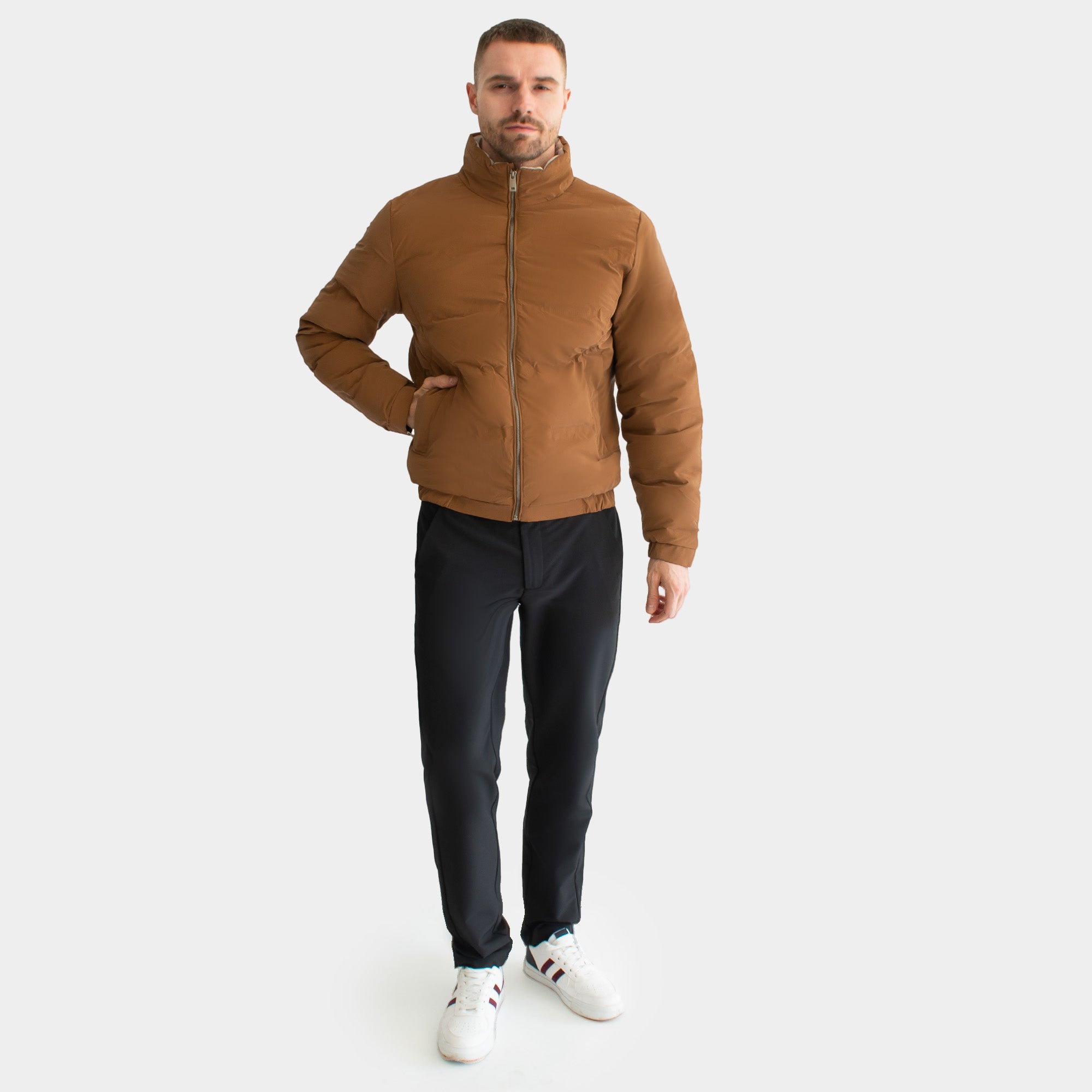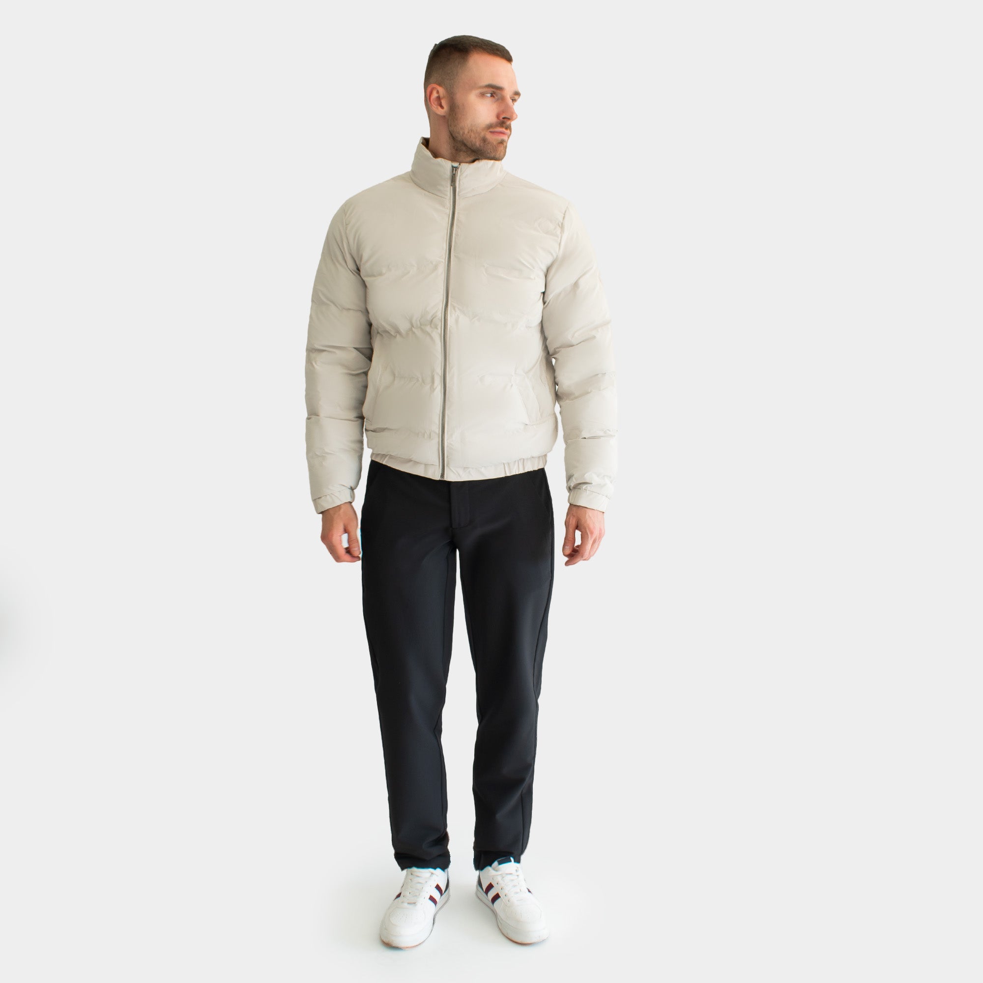 Chamarra de cuello alto acolchada para caballero, con capitonado sellado térmicamente que elimina las costuras visibles.