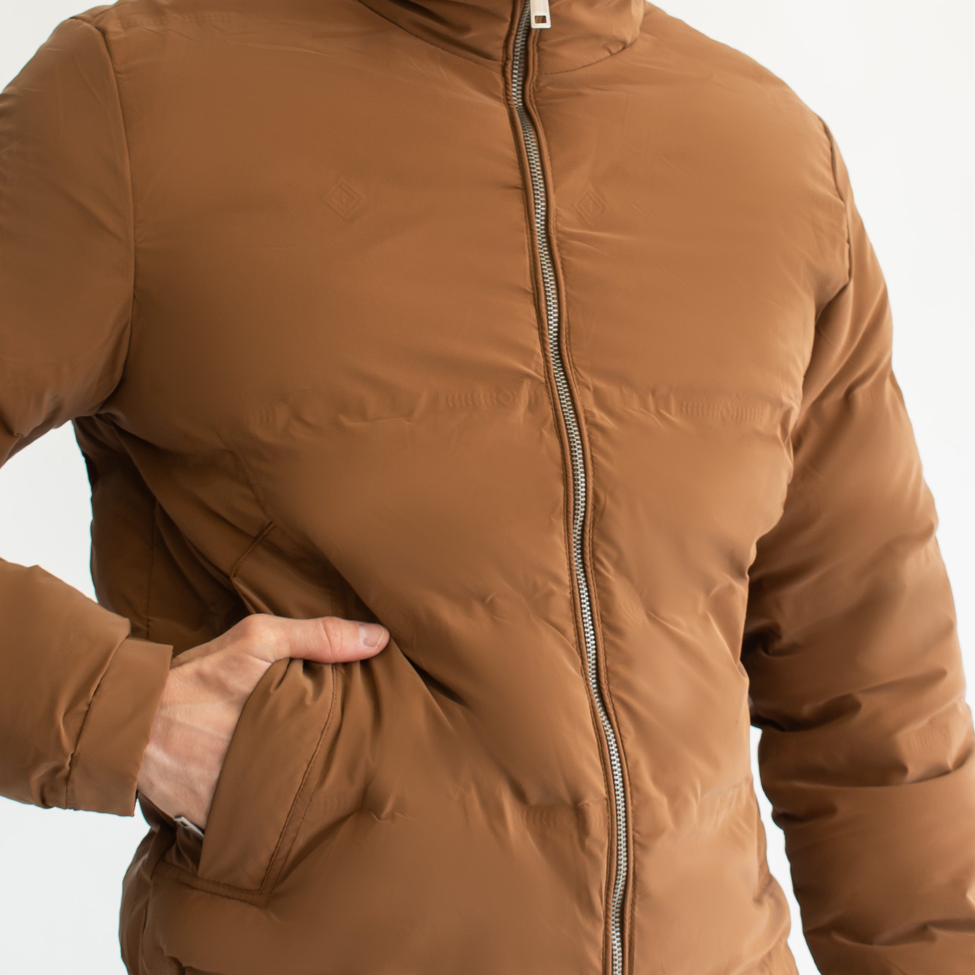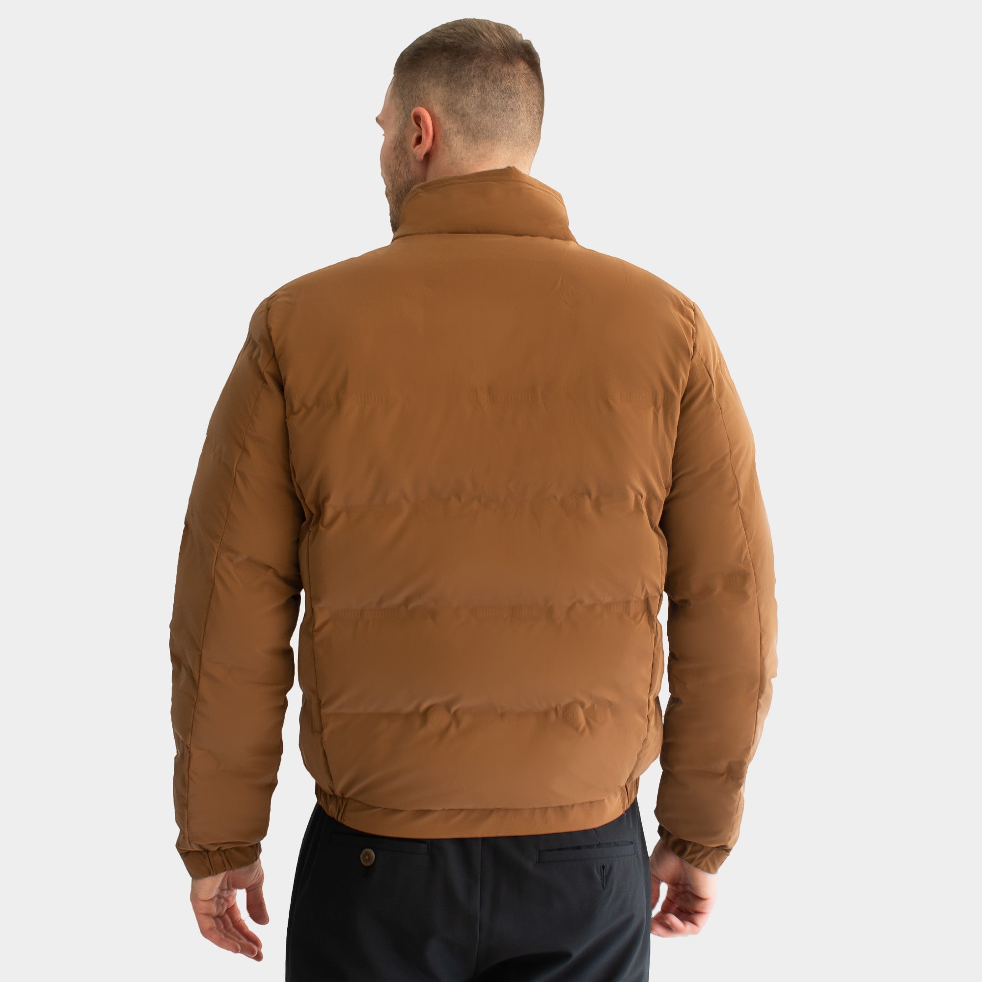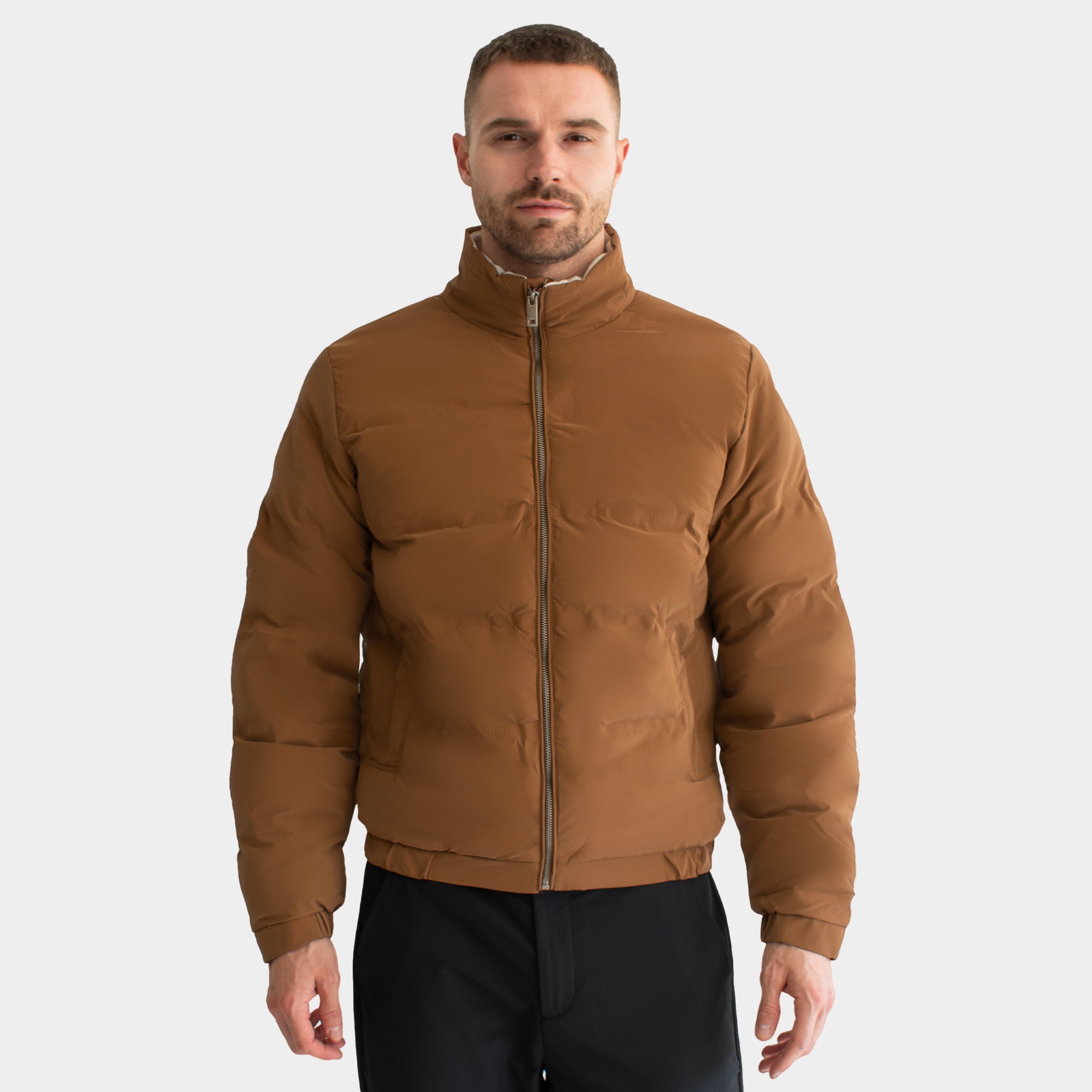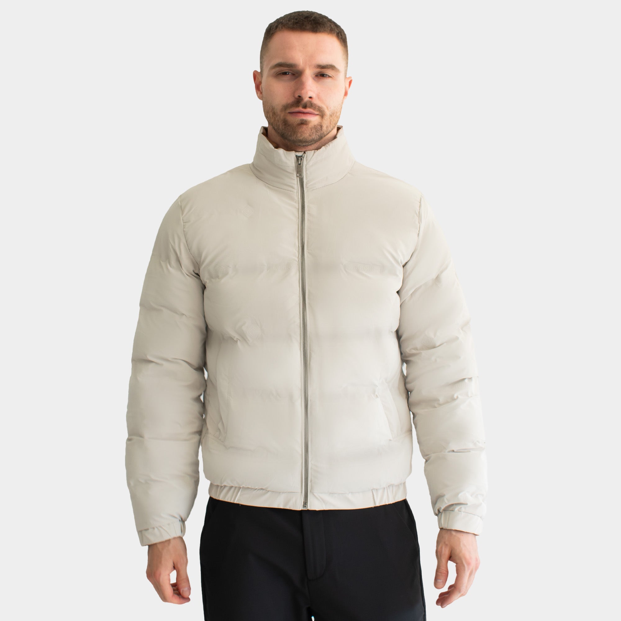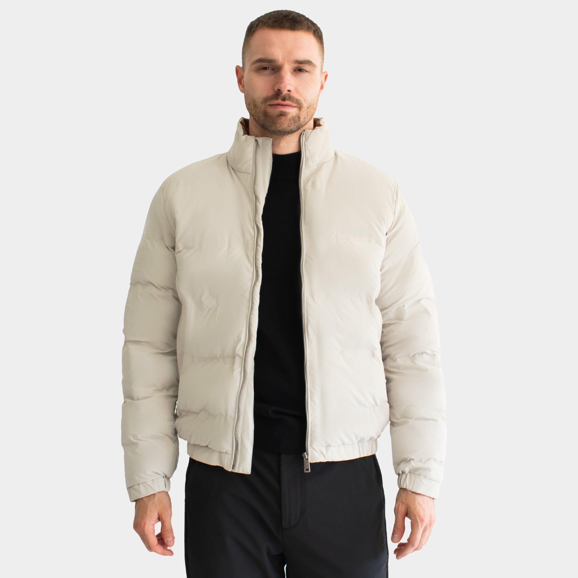 Chamarra de cuello alto acolchada para caballero, con capitonado sellado térmicamente que elimina las costuras visibles.