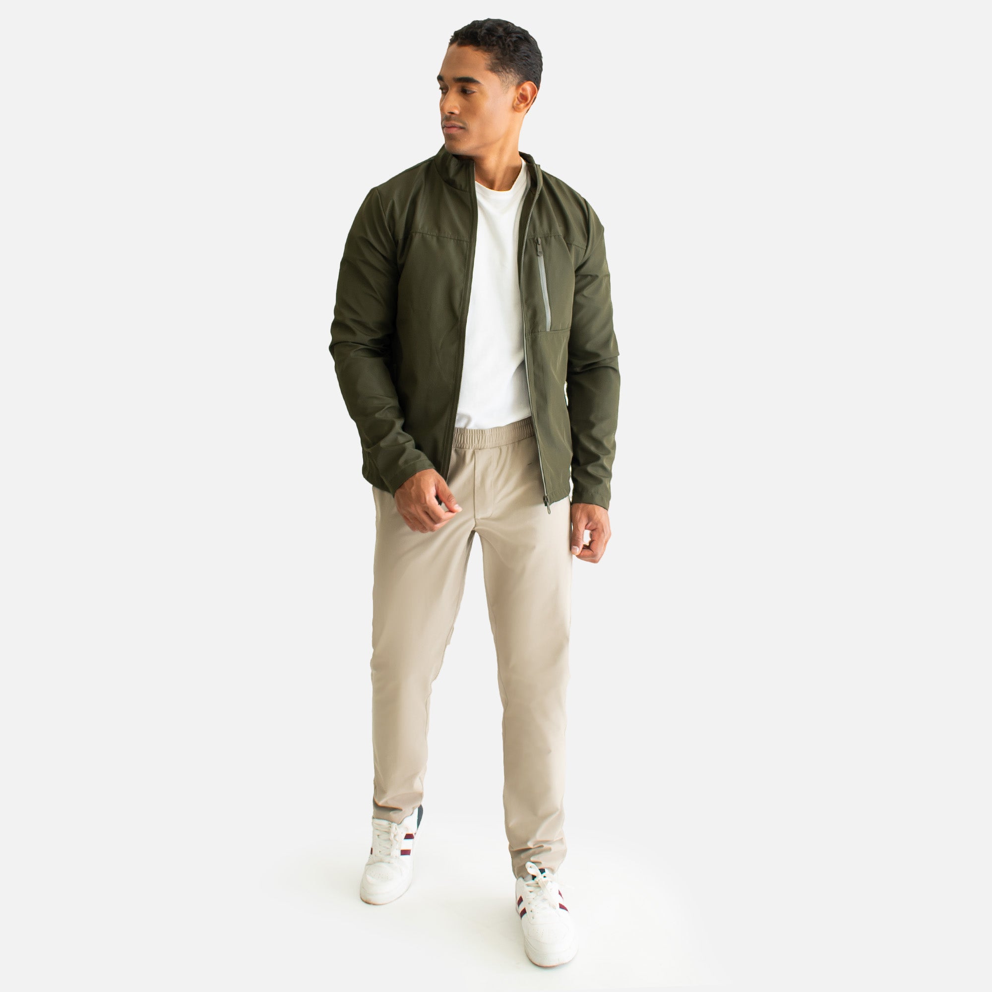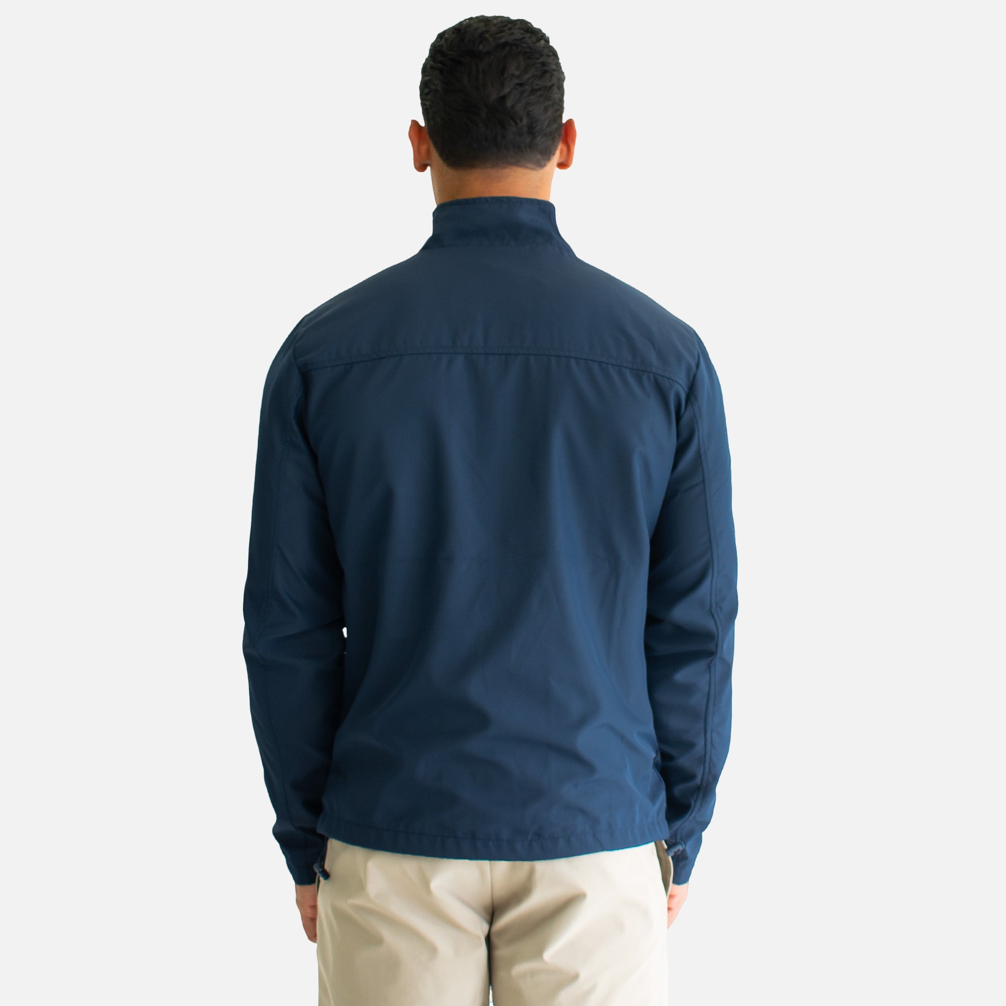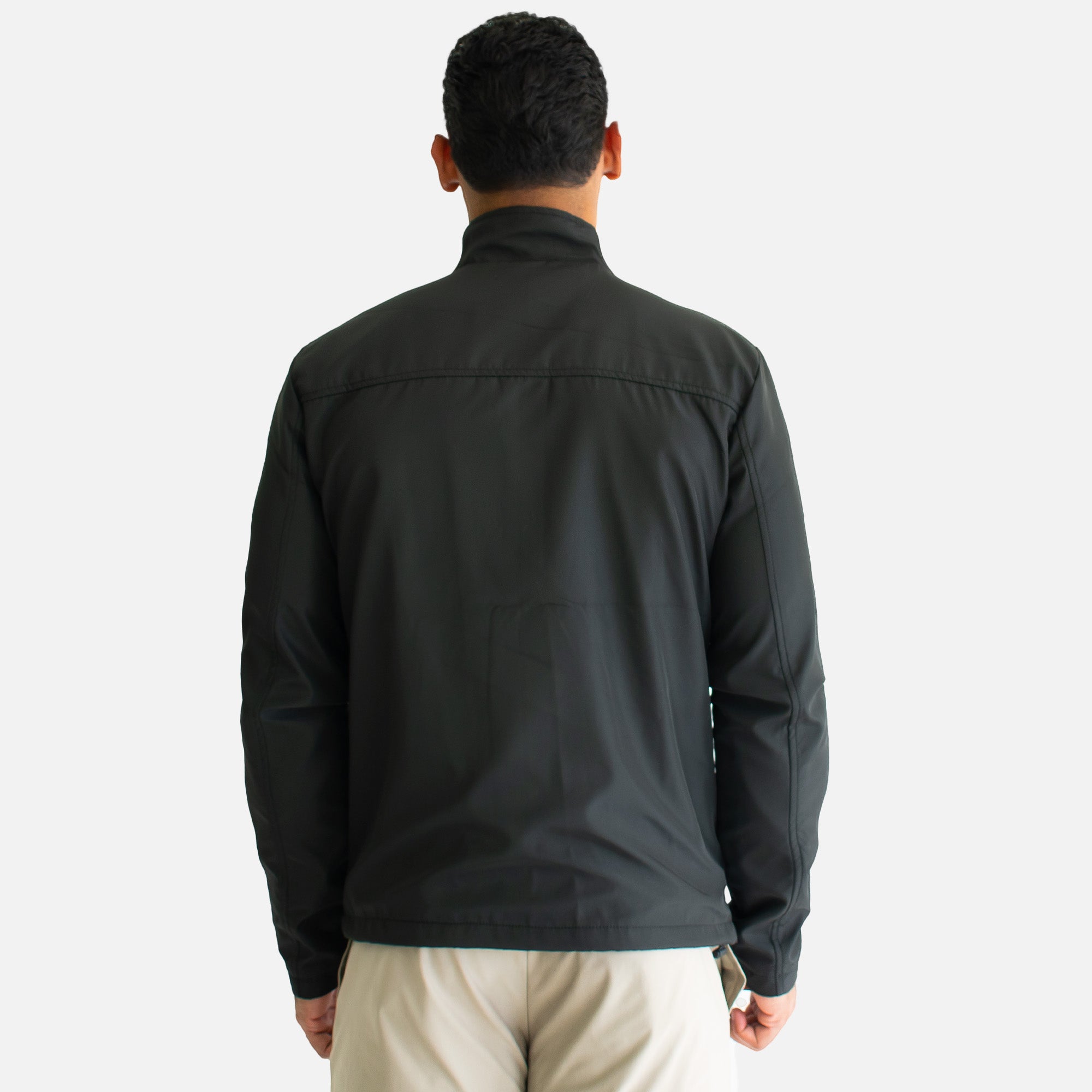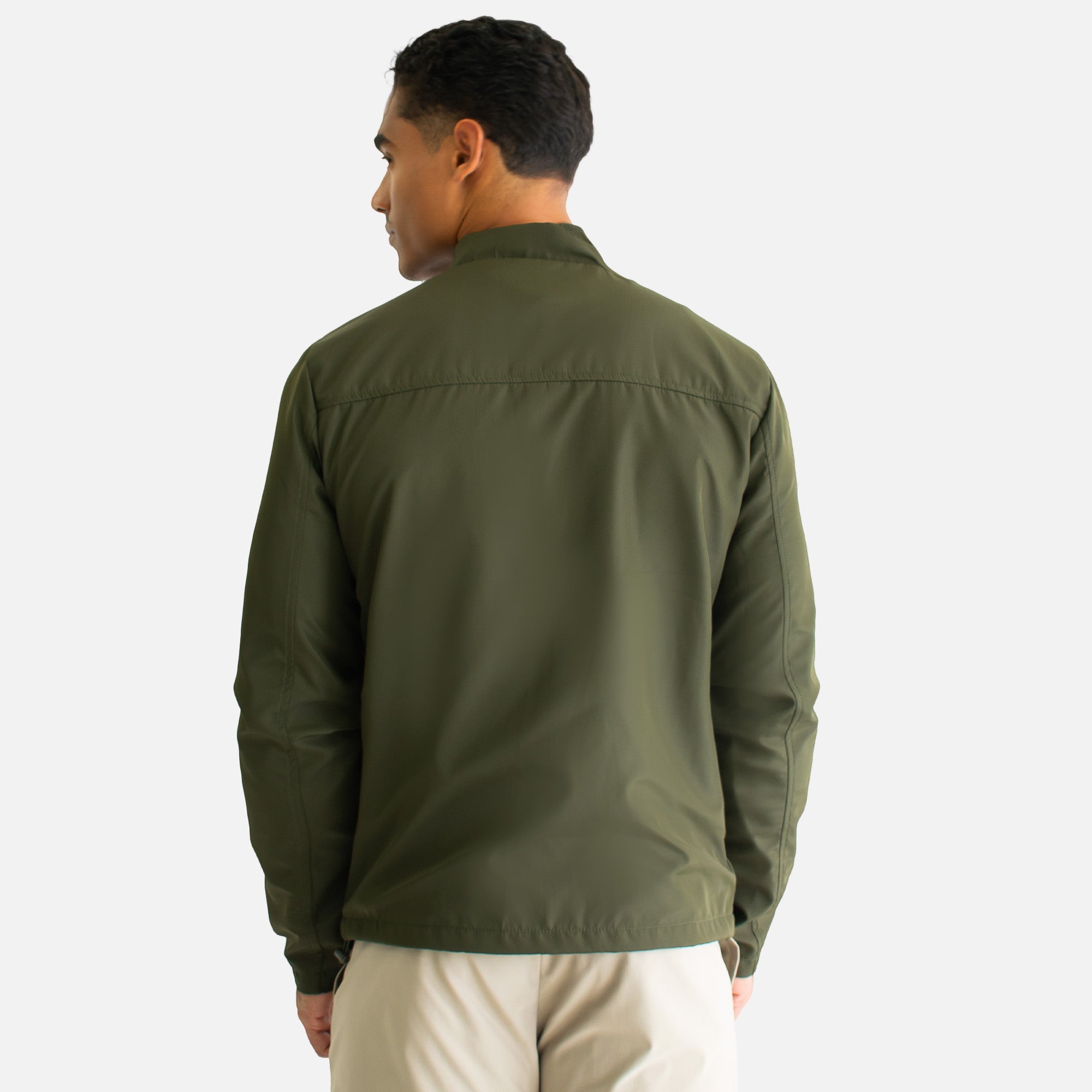 Chamarra de cuello alto con cierre frontal y resorte en la cintura.