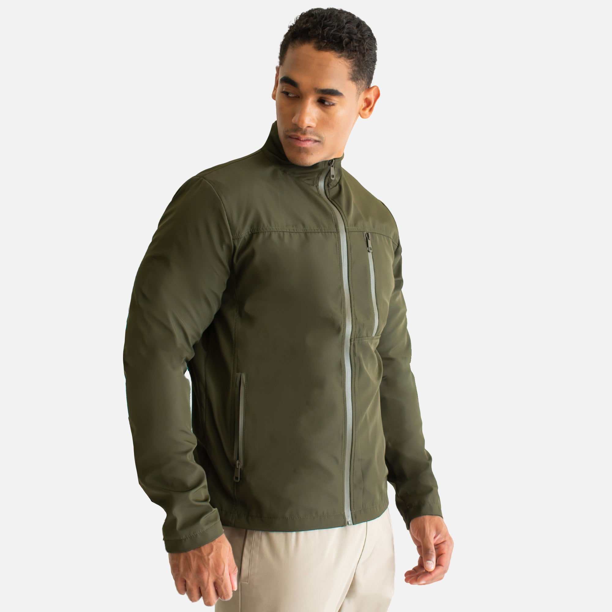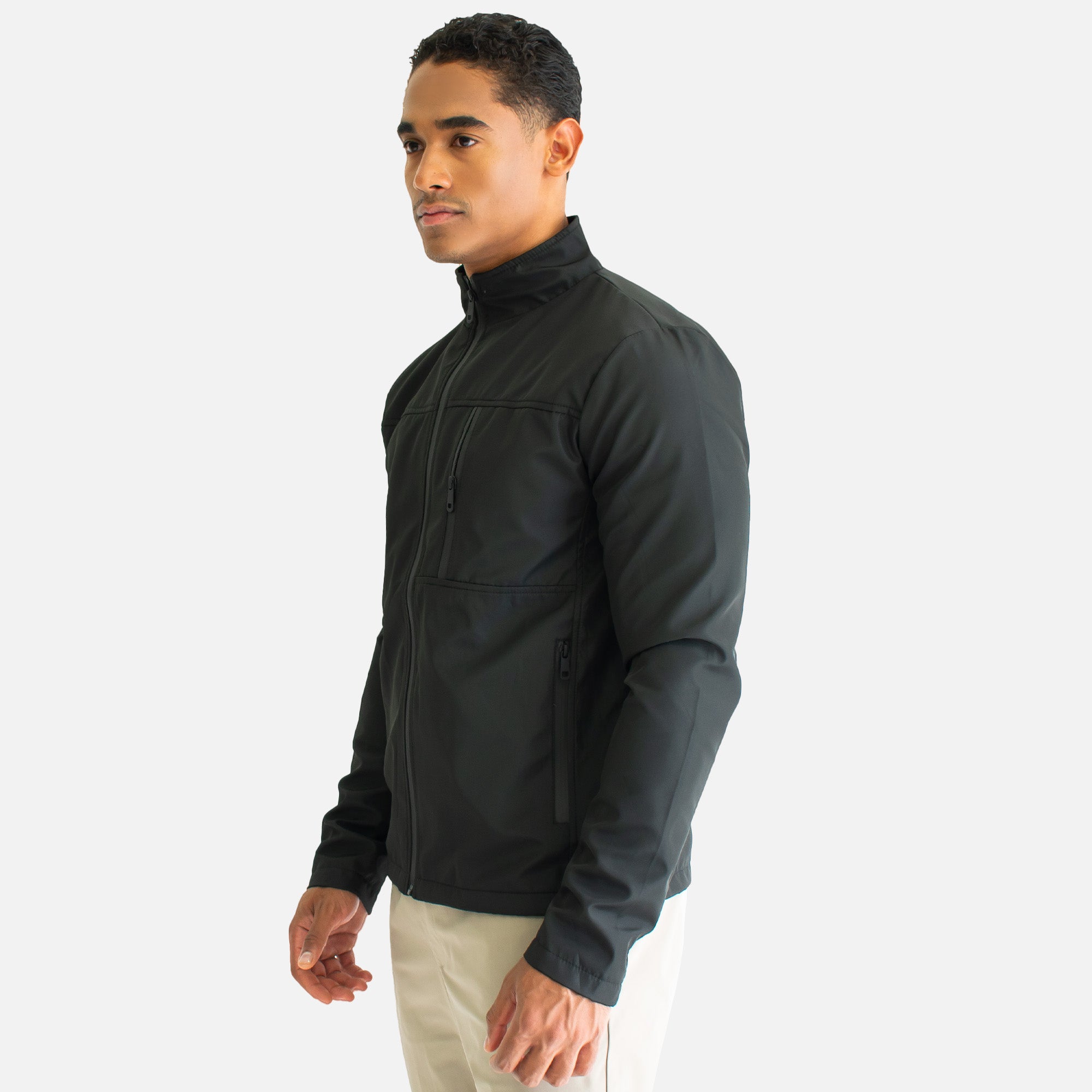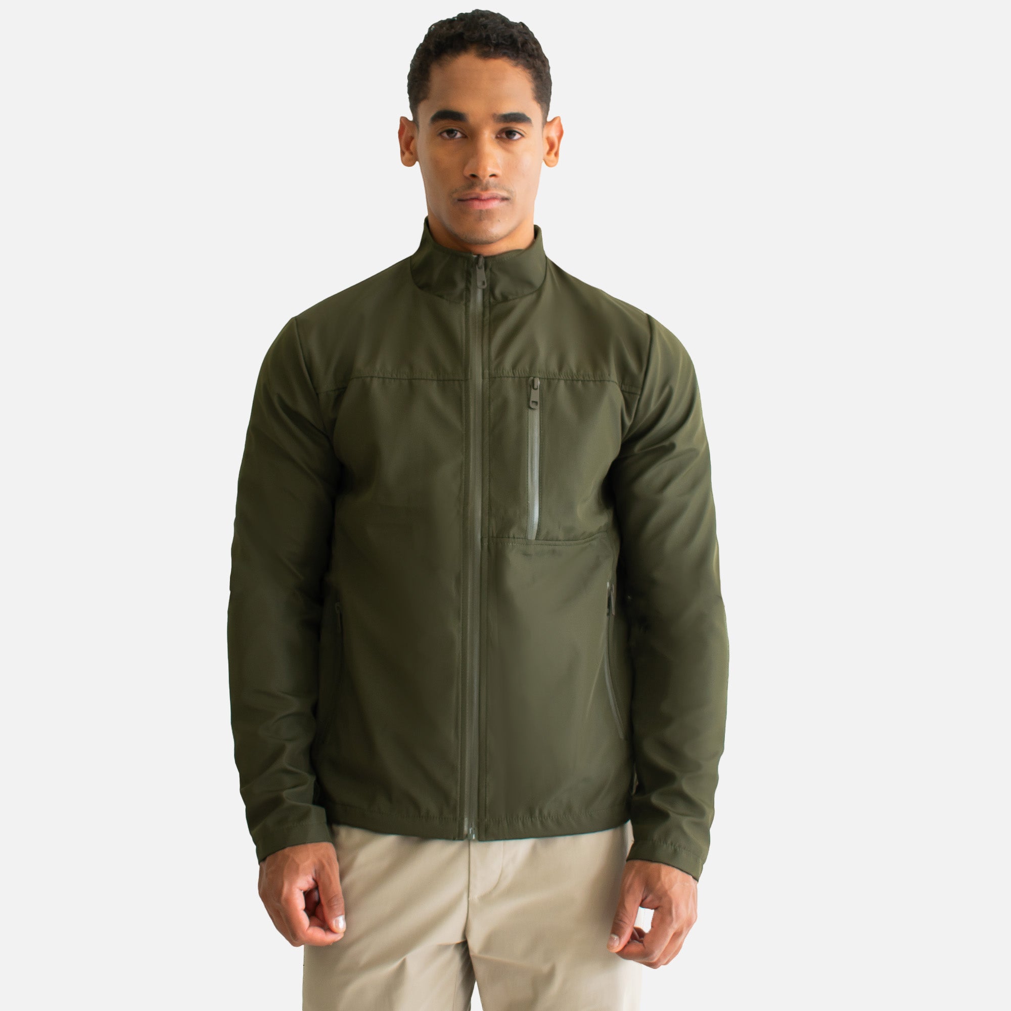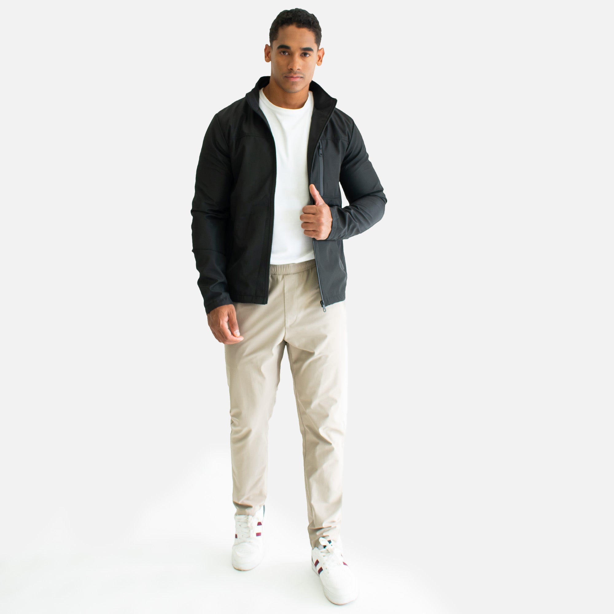 Chamarra de cuello alto con cierre frontal y resorte en la cintura.
