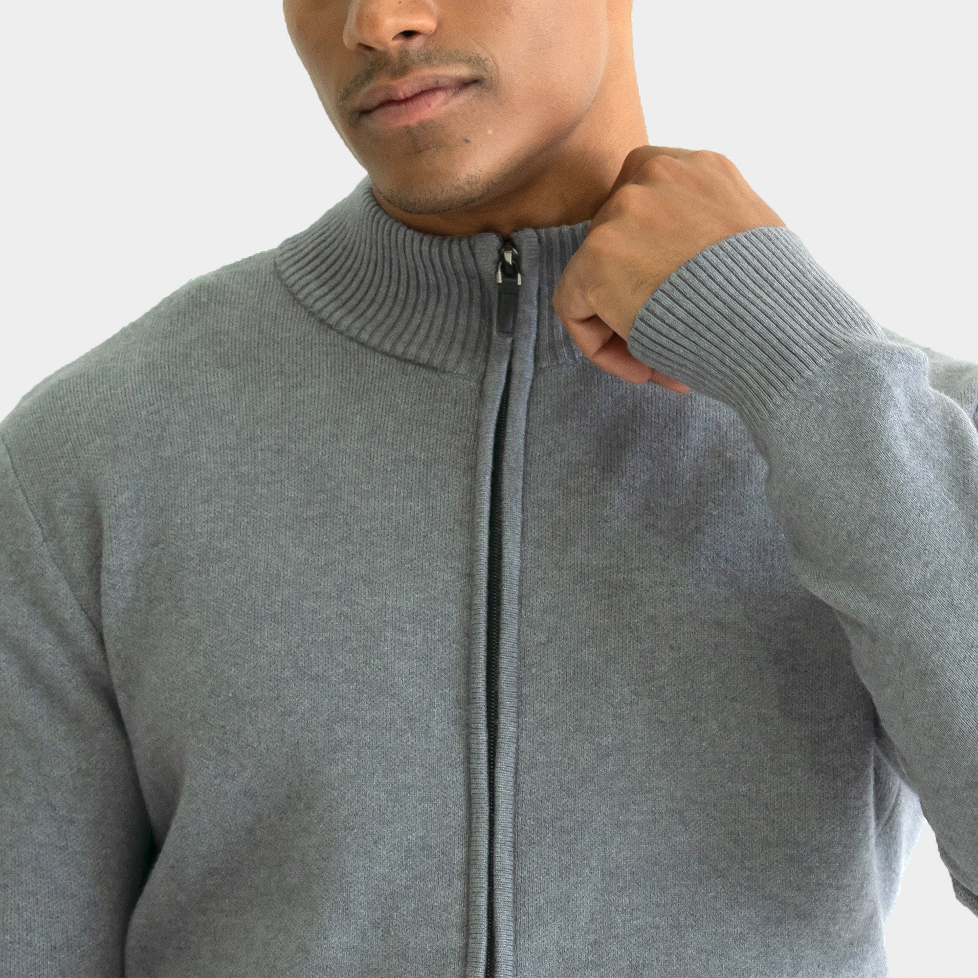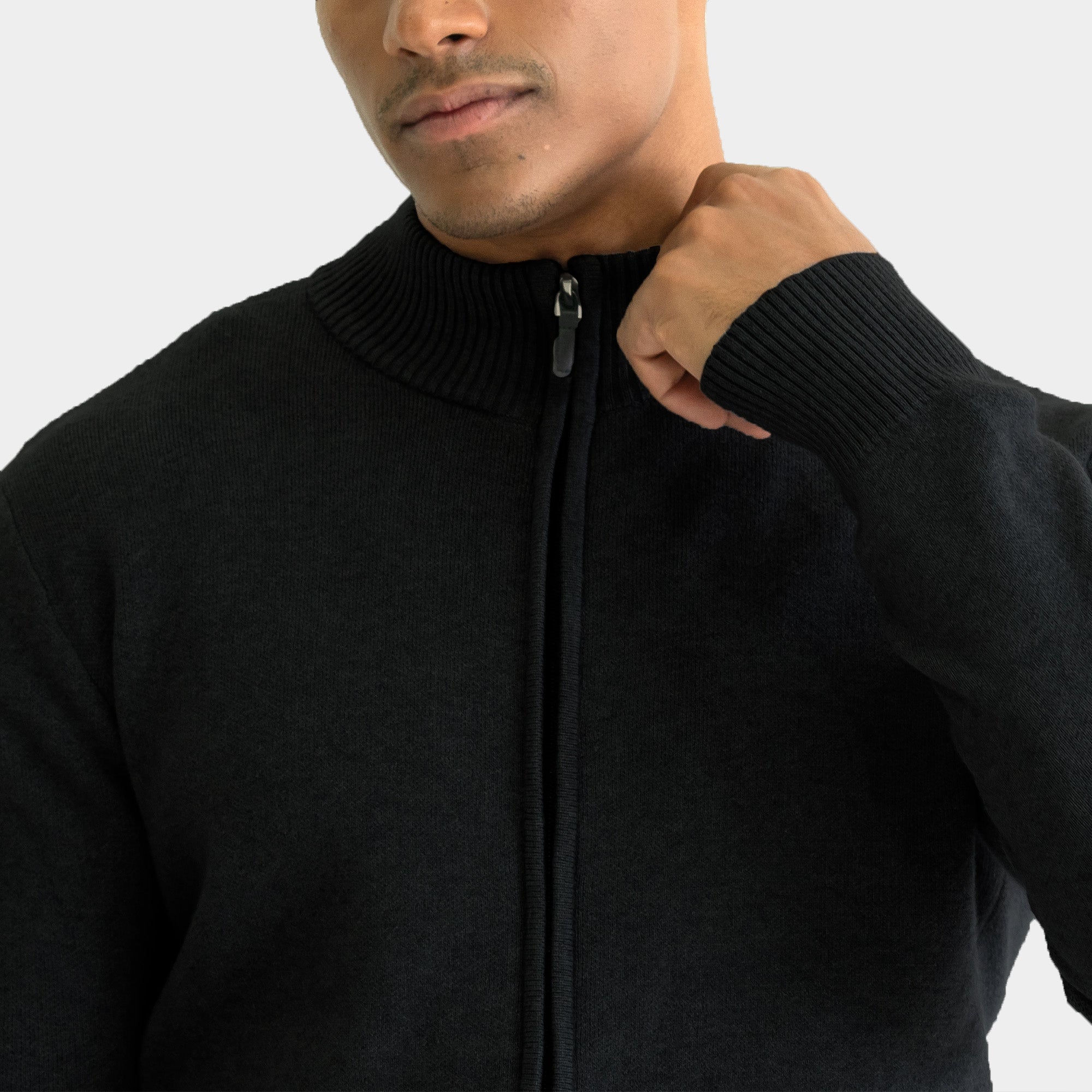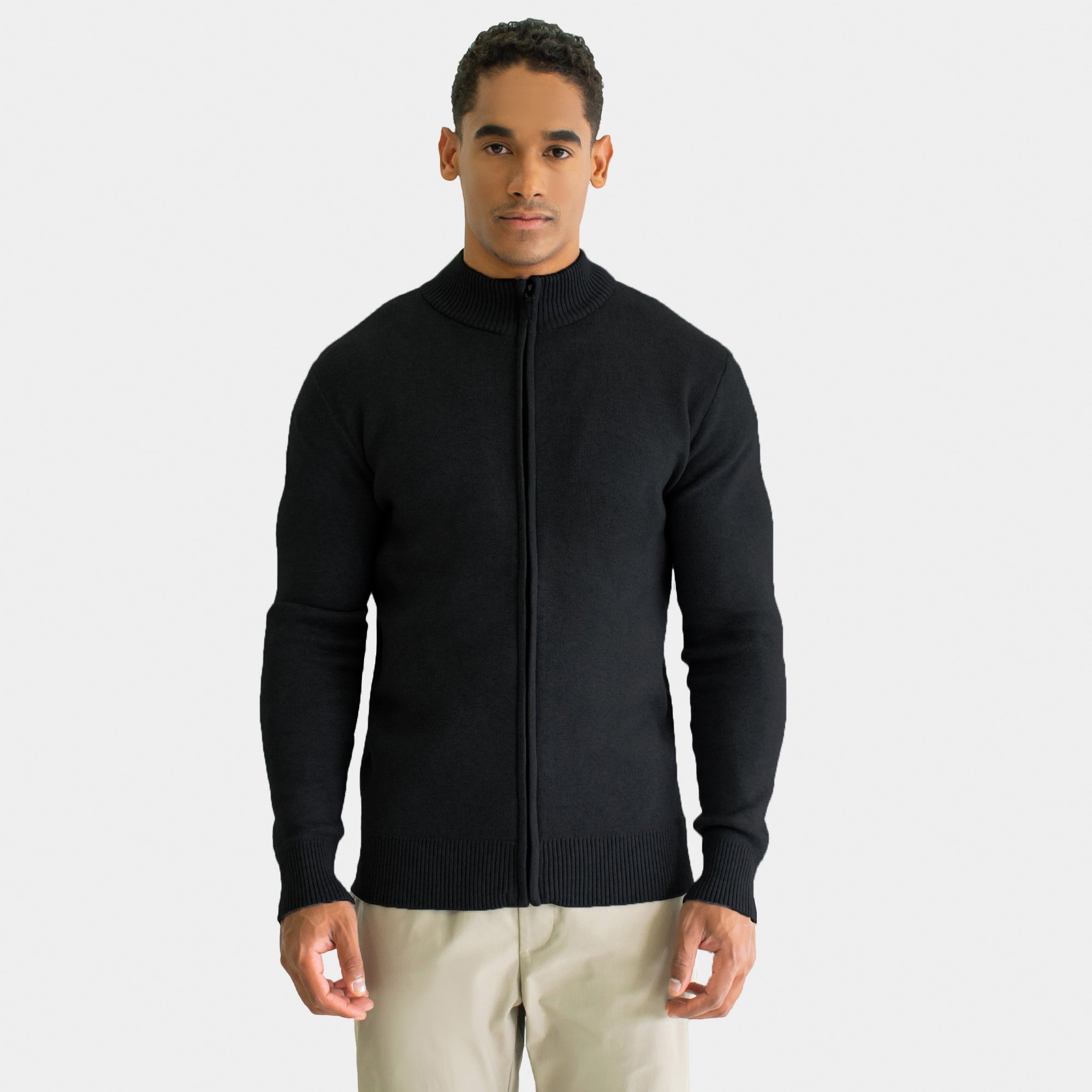 Suéter de manga larga con tejido grueso, cierre completo y cuello alto.