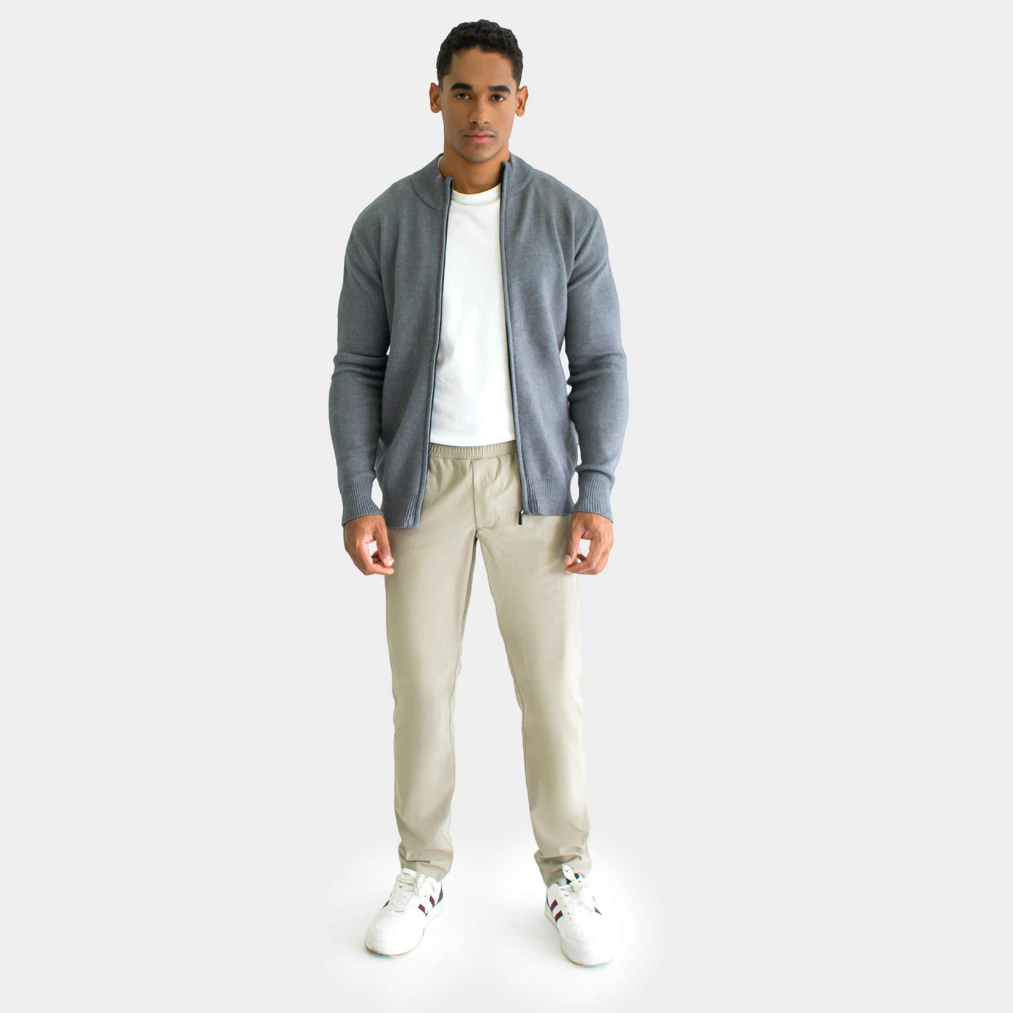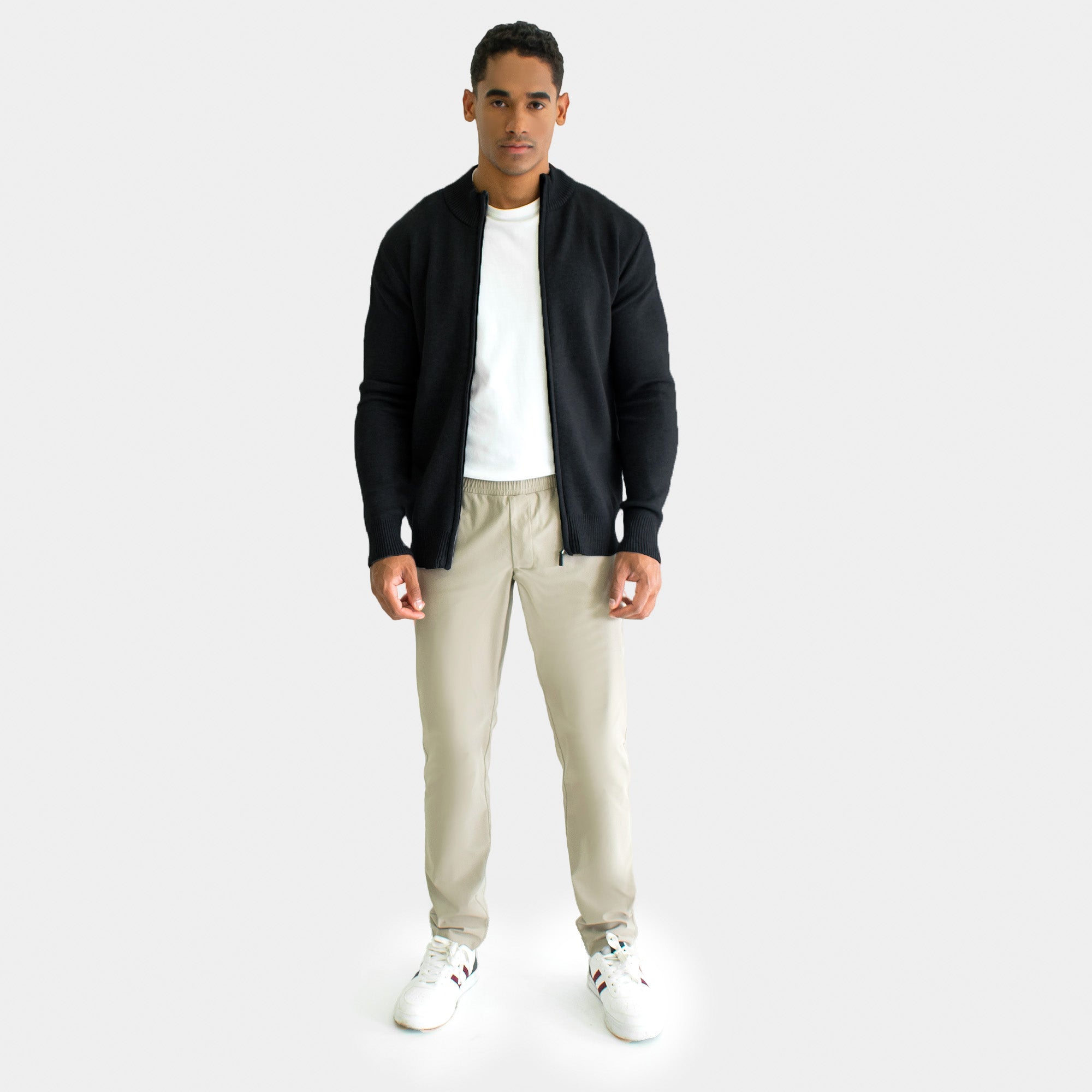 Presenta acabados en rib en cuello, puños y cintura que aportan estructura y definición al diseño