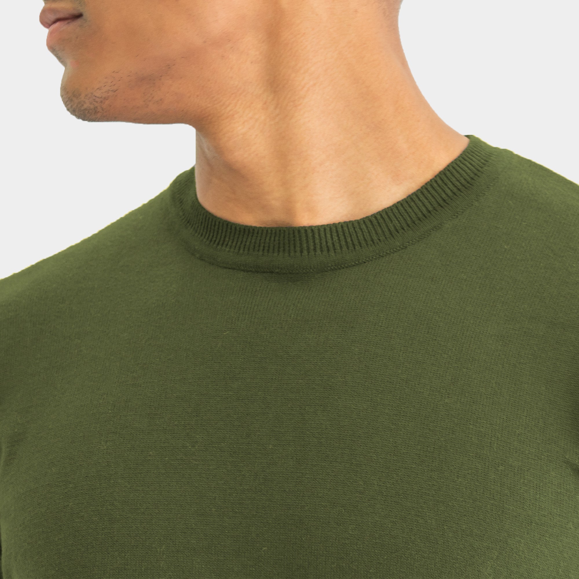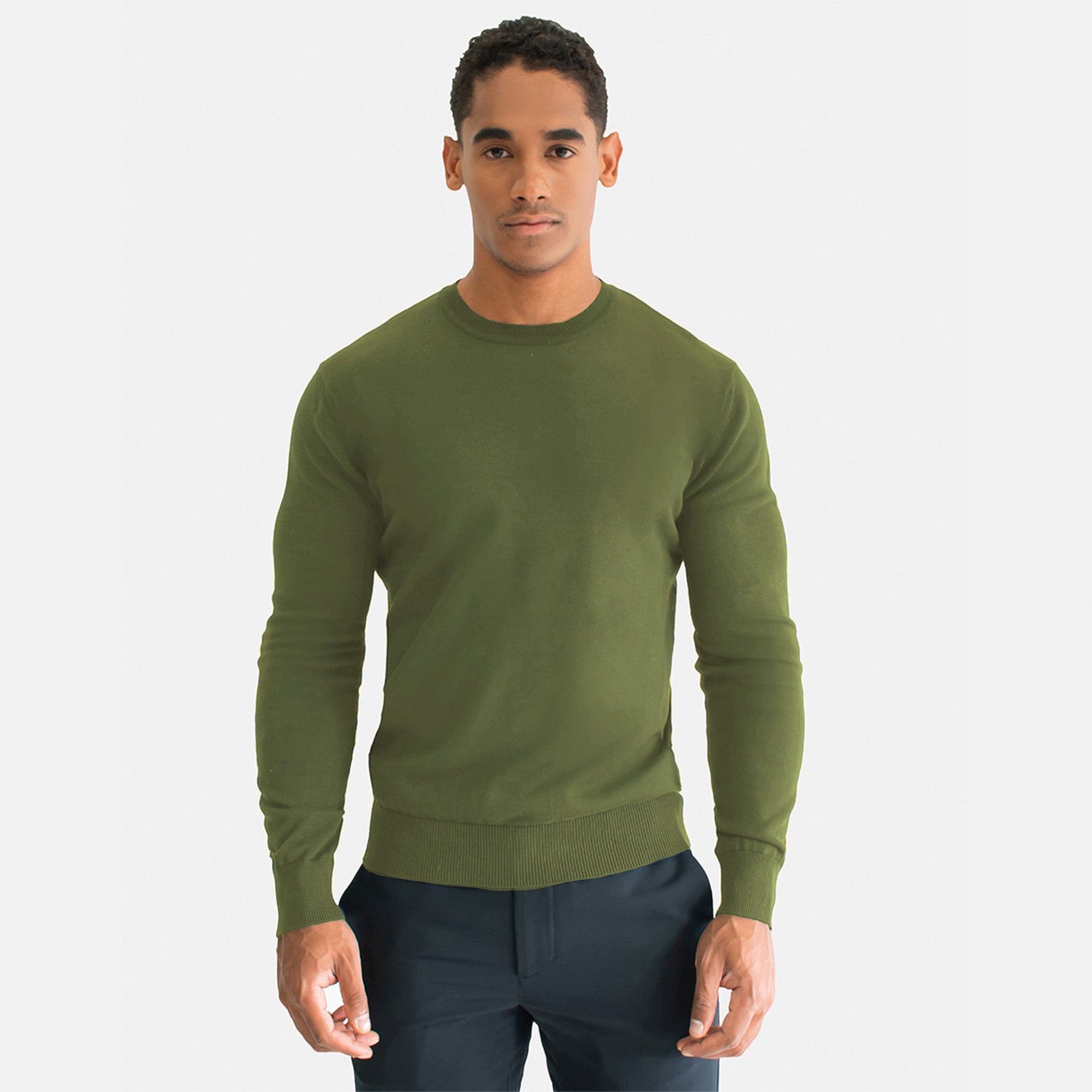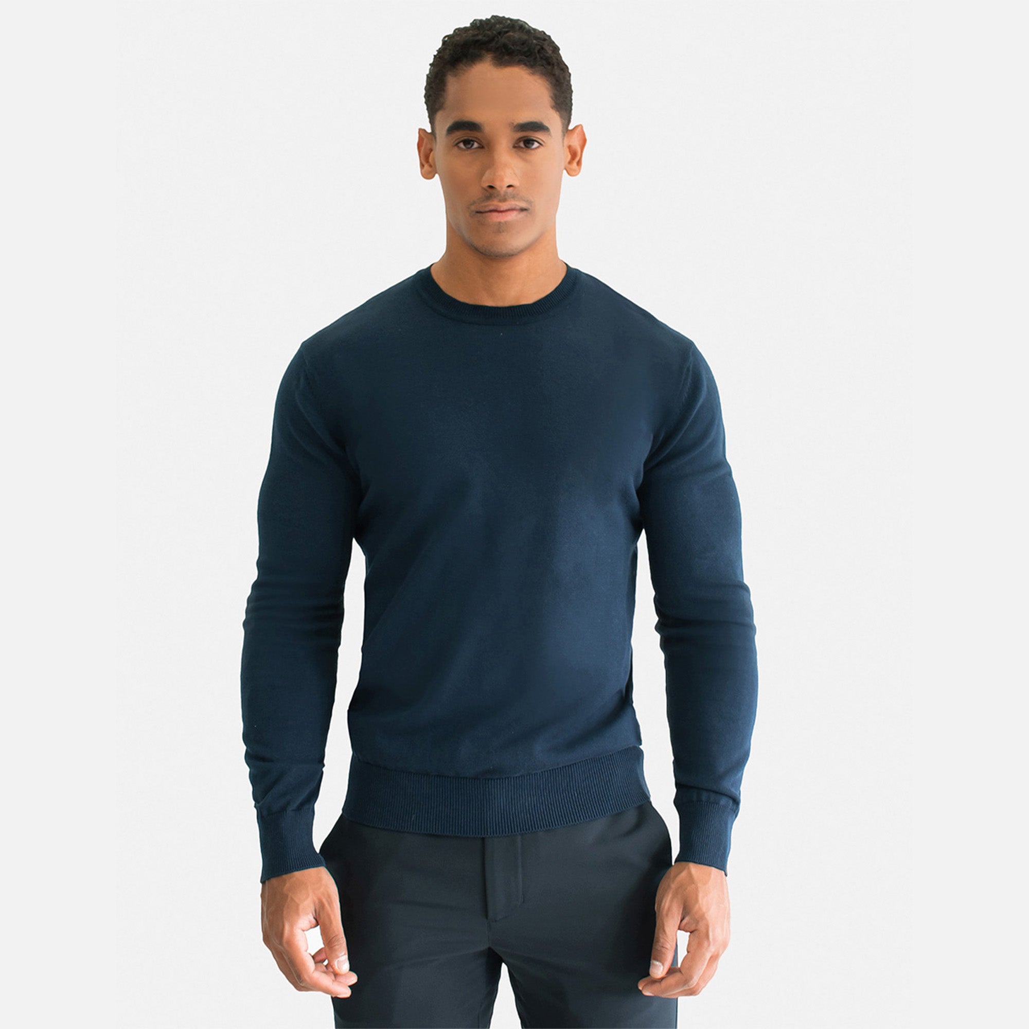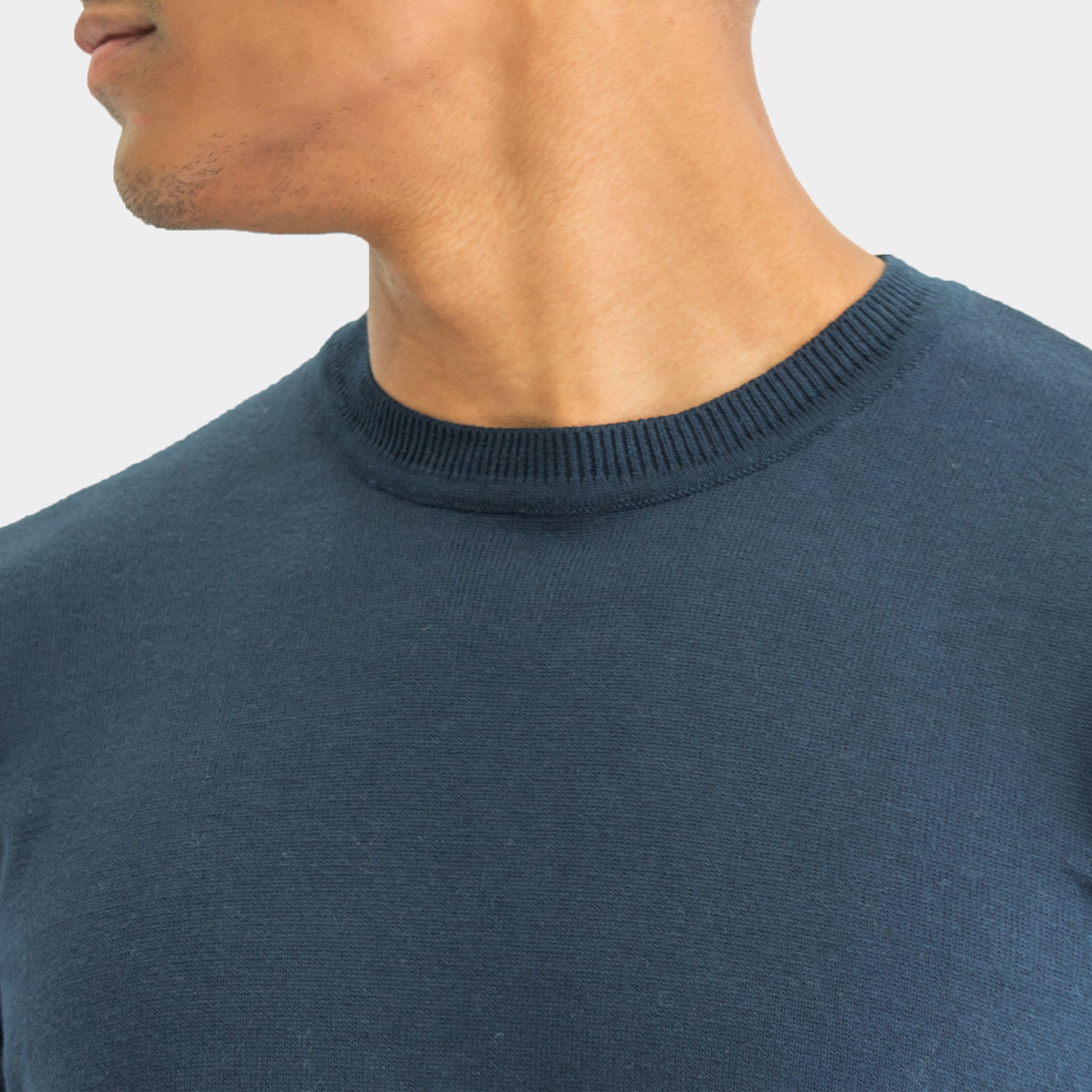 Suéter ligero de cuello redondo y manga larga, corte regular fit, suave al tacto y fresco al usarlo.