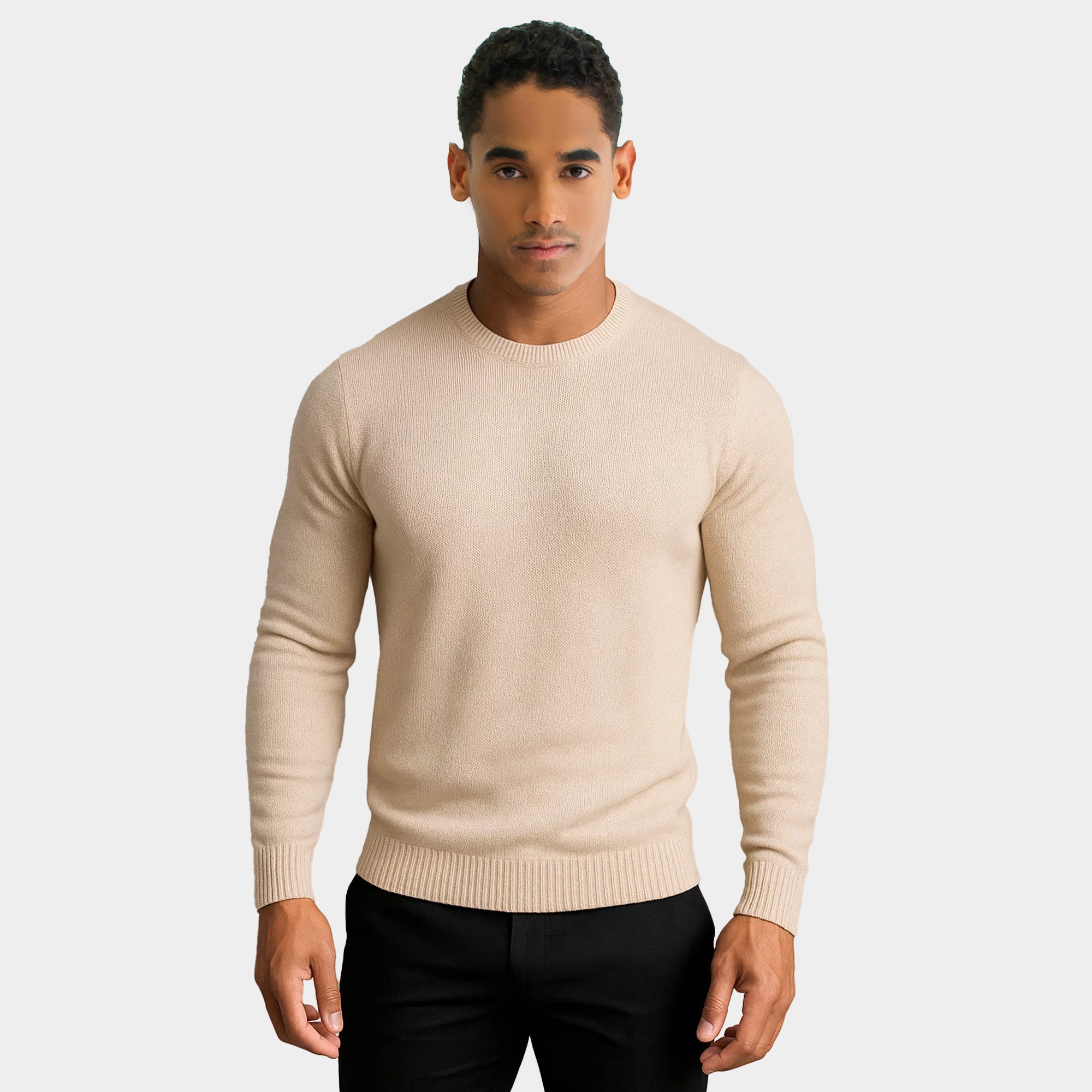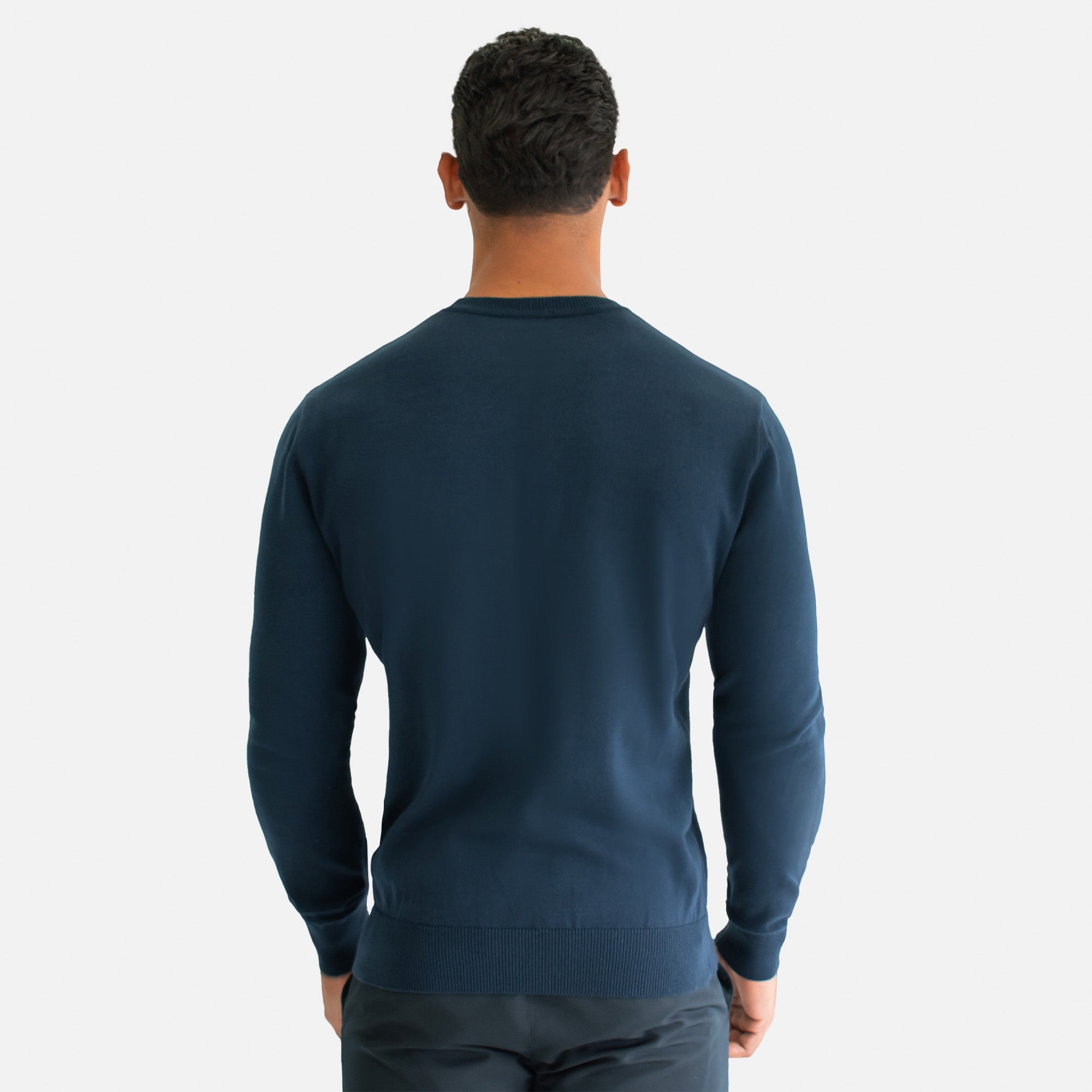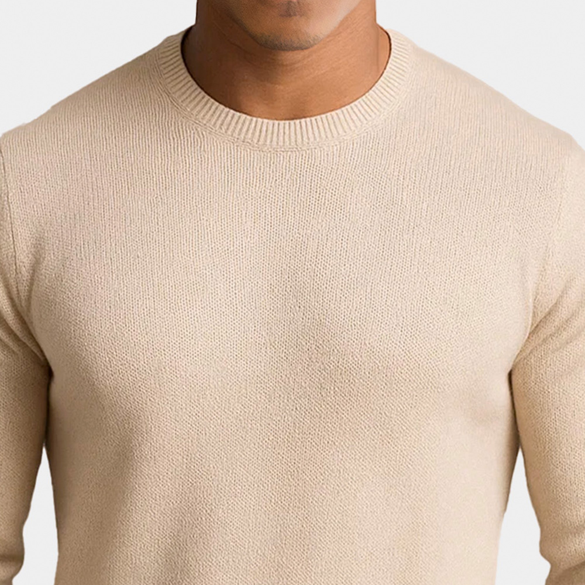 Suéter ligero de cuello redondo y manga larga, corte regular fit, suave al tacto y fresco al usarlo.
