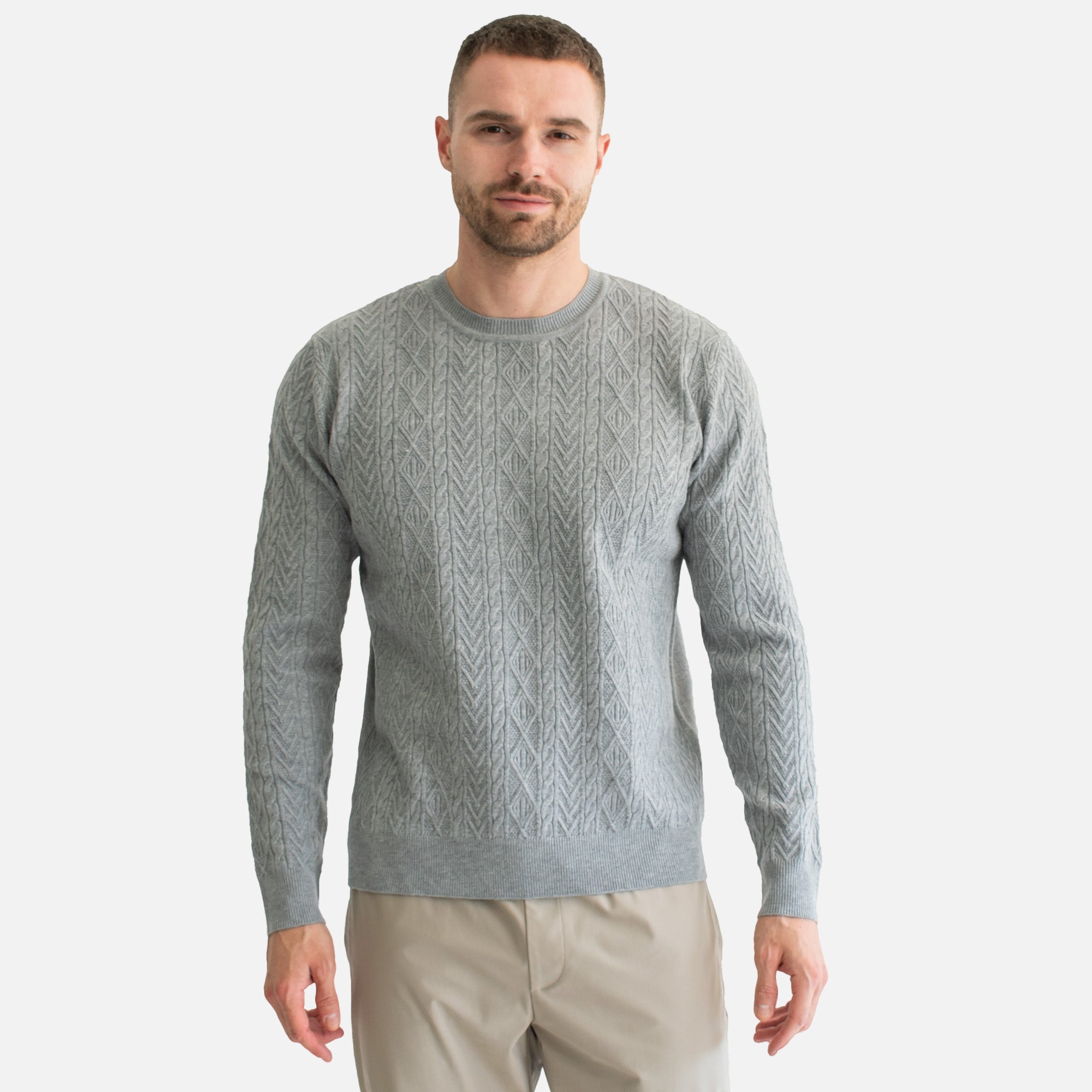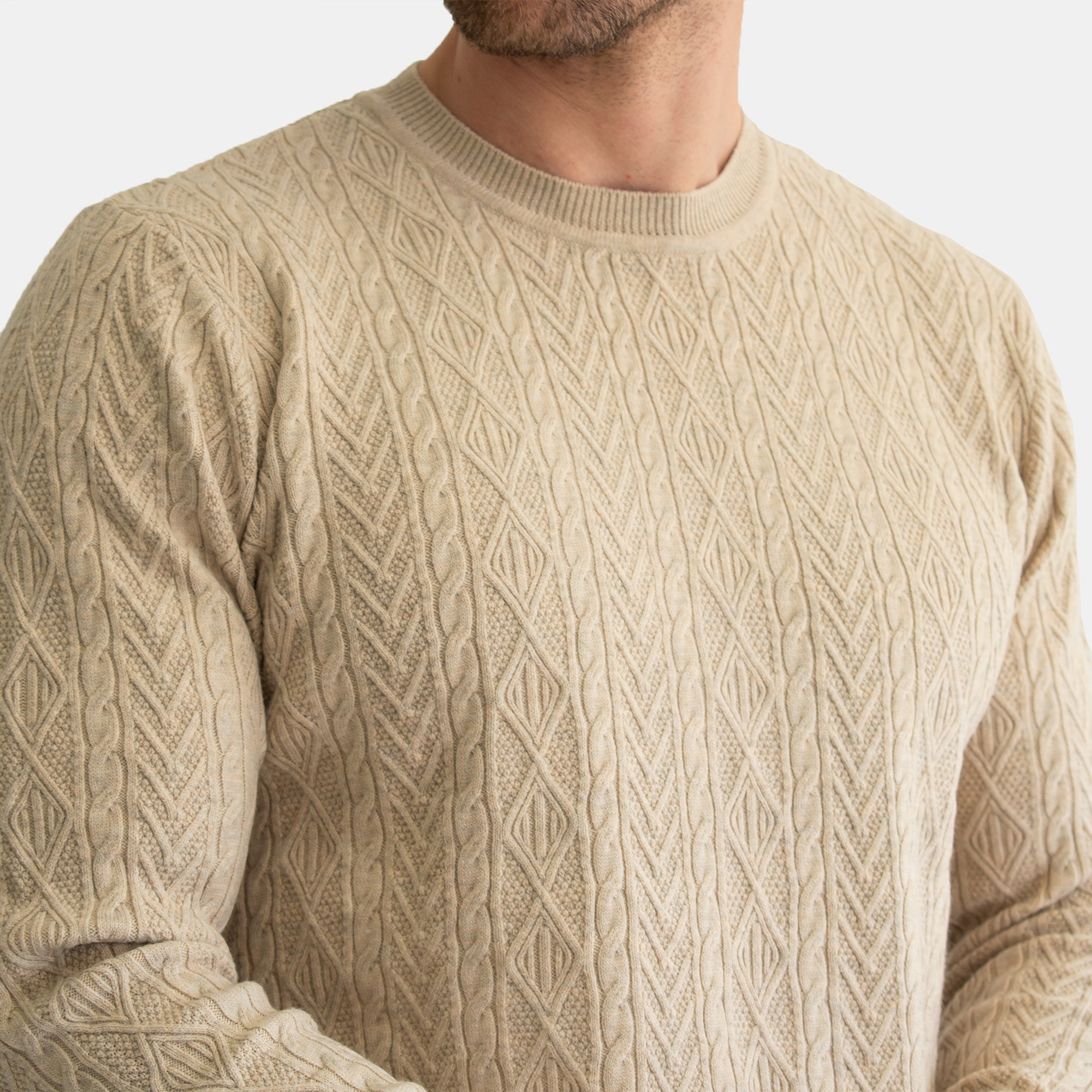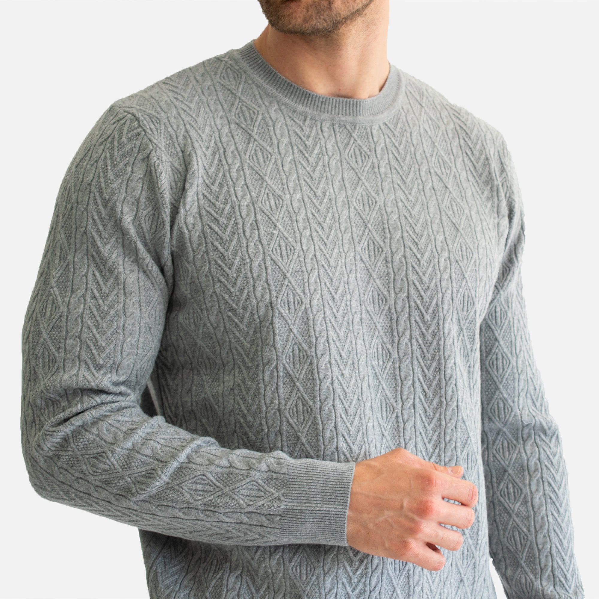 Suéter de manga larga con corte regular fit, tejido trenzado y acabado en rib en cuello, puños y cintura. Su estilo clásico y atemporal lo convierte en una prenda versátil y elegante.