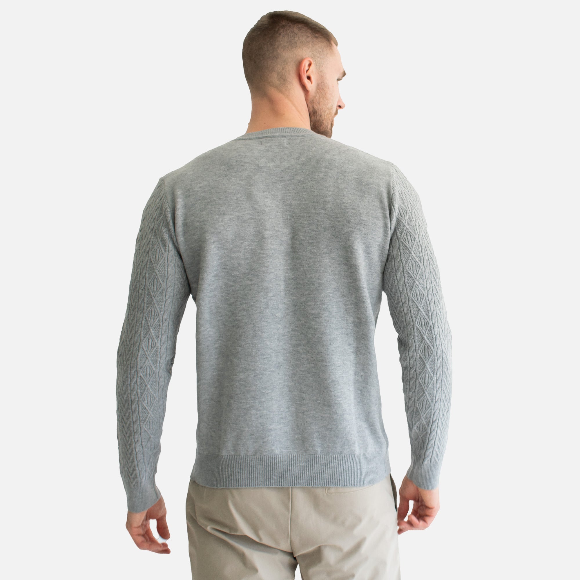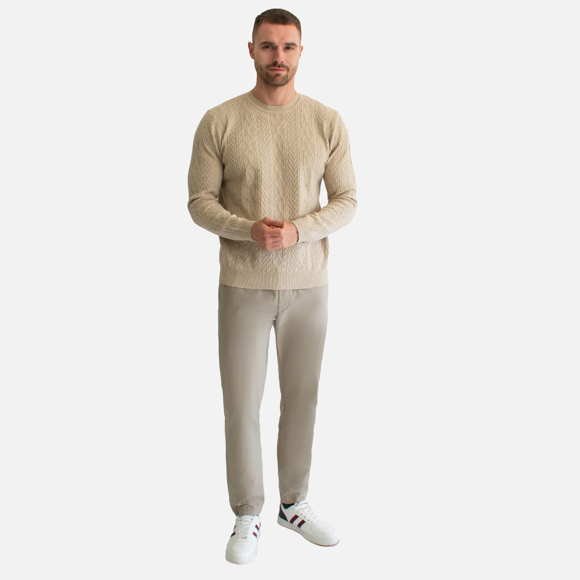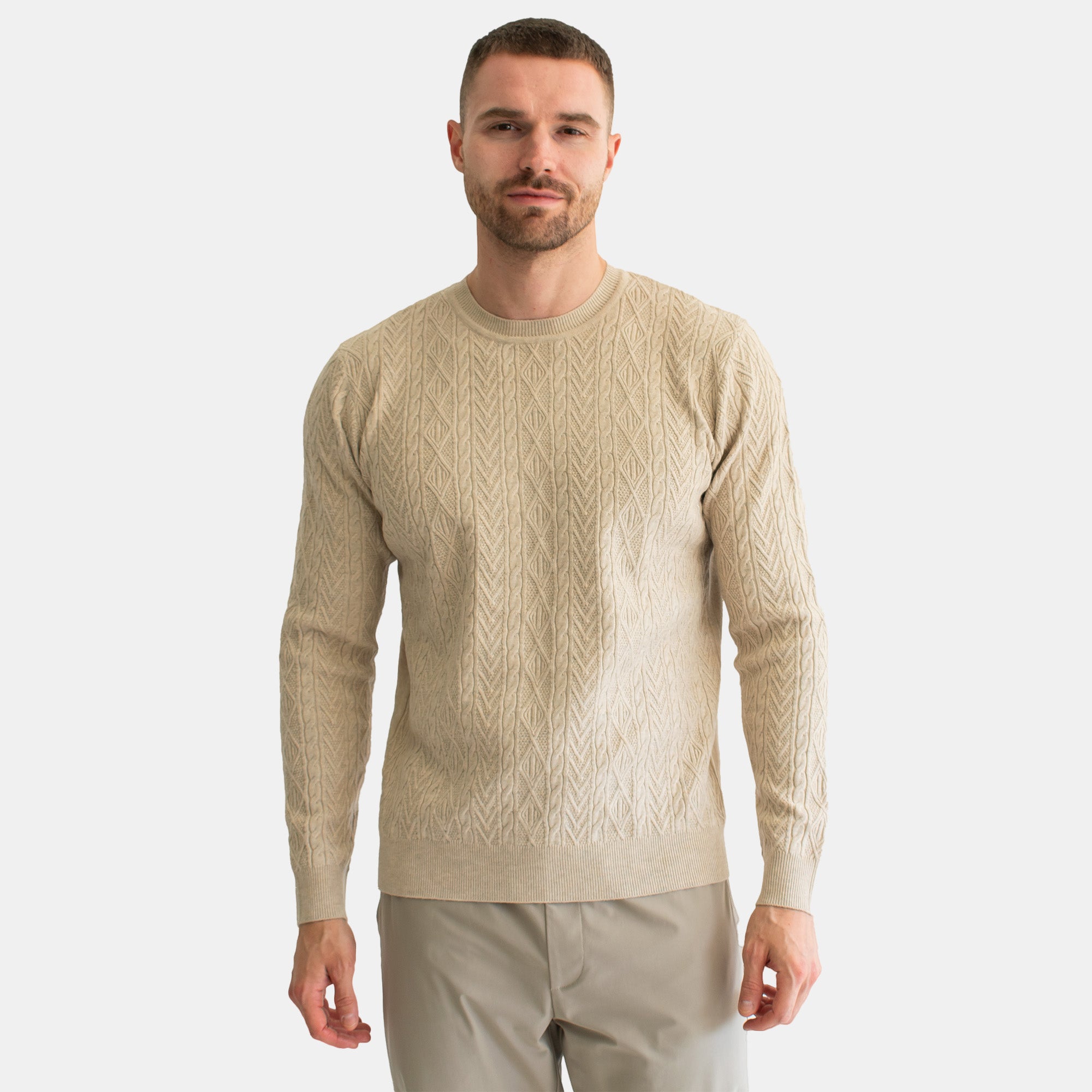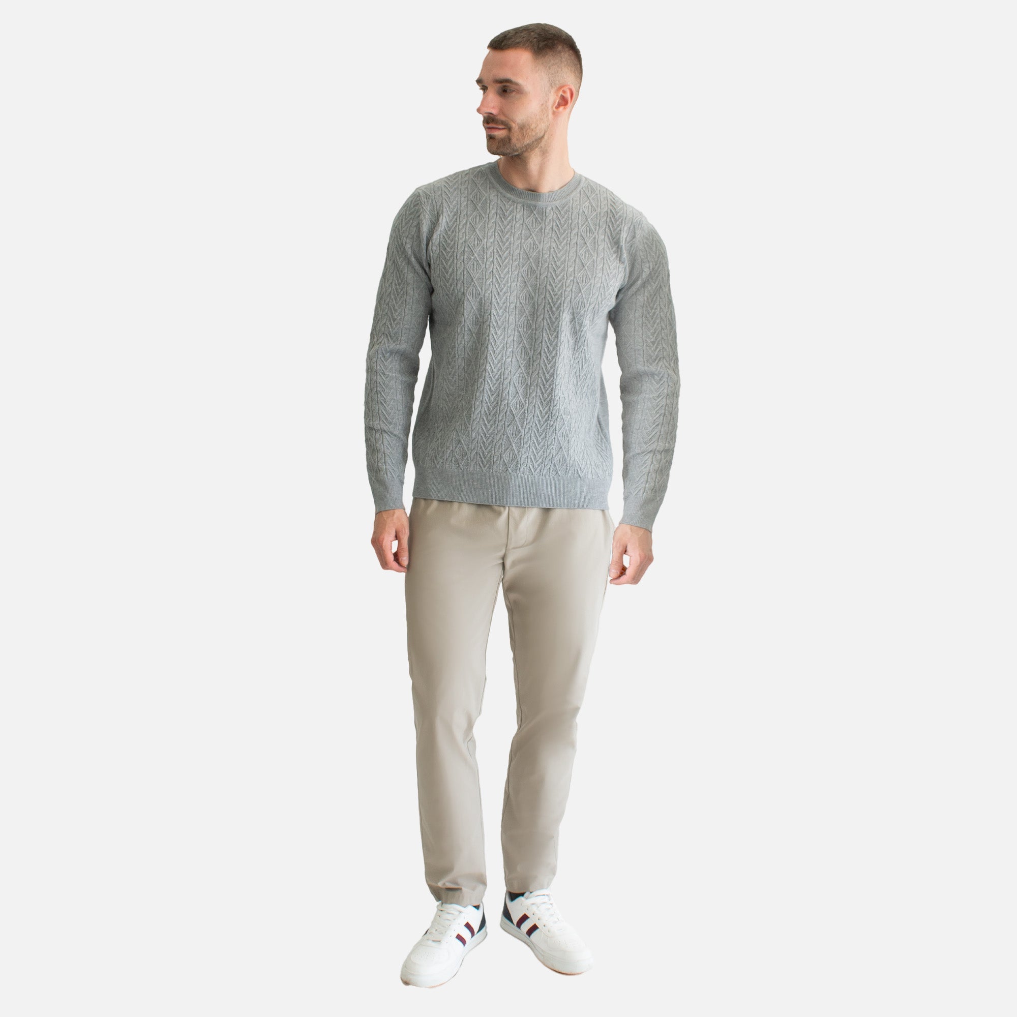Suéter de manga larga con corte regular fit, tejido trenzado y acabado en rib en cuello, puños y cintura. Su estilo clásico y atemporal lo convierte en una prenda versátil y elegante.
