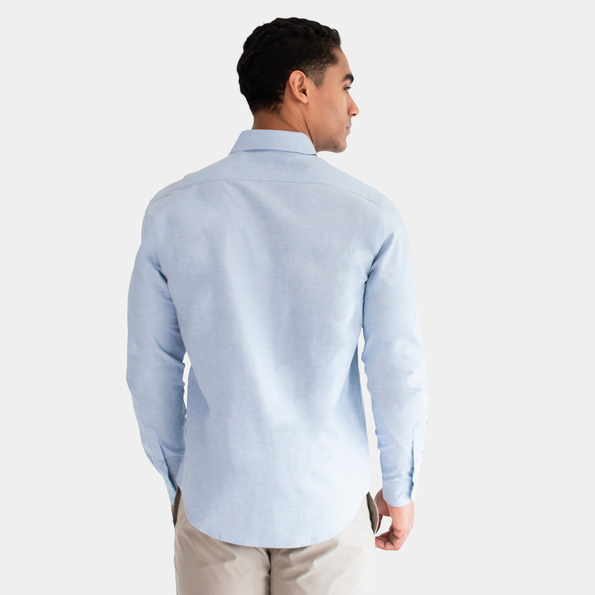 Camisa de manga larga en un tejido vaporoso con apariencia de lino y cuello vuelto. El frente lleva una aletilla con botones al tono que mantiene un look limpio y relajado.