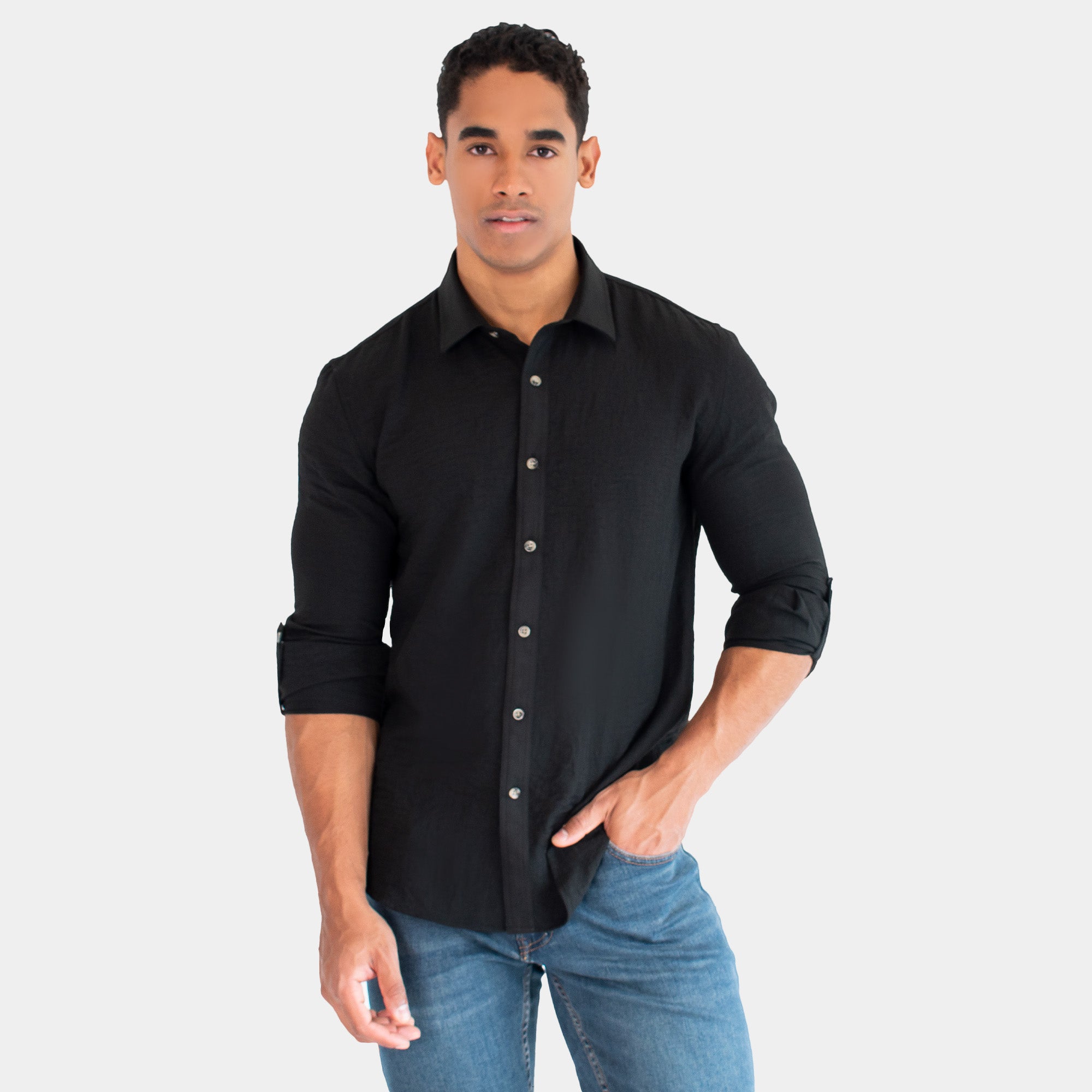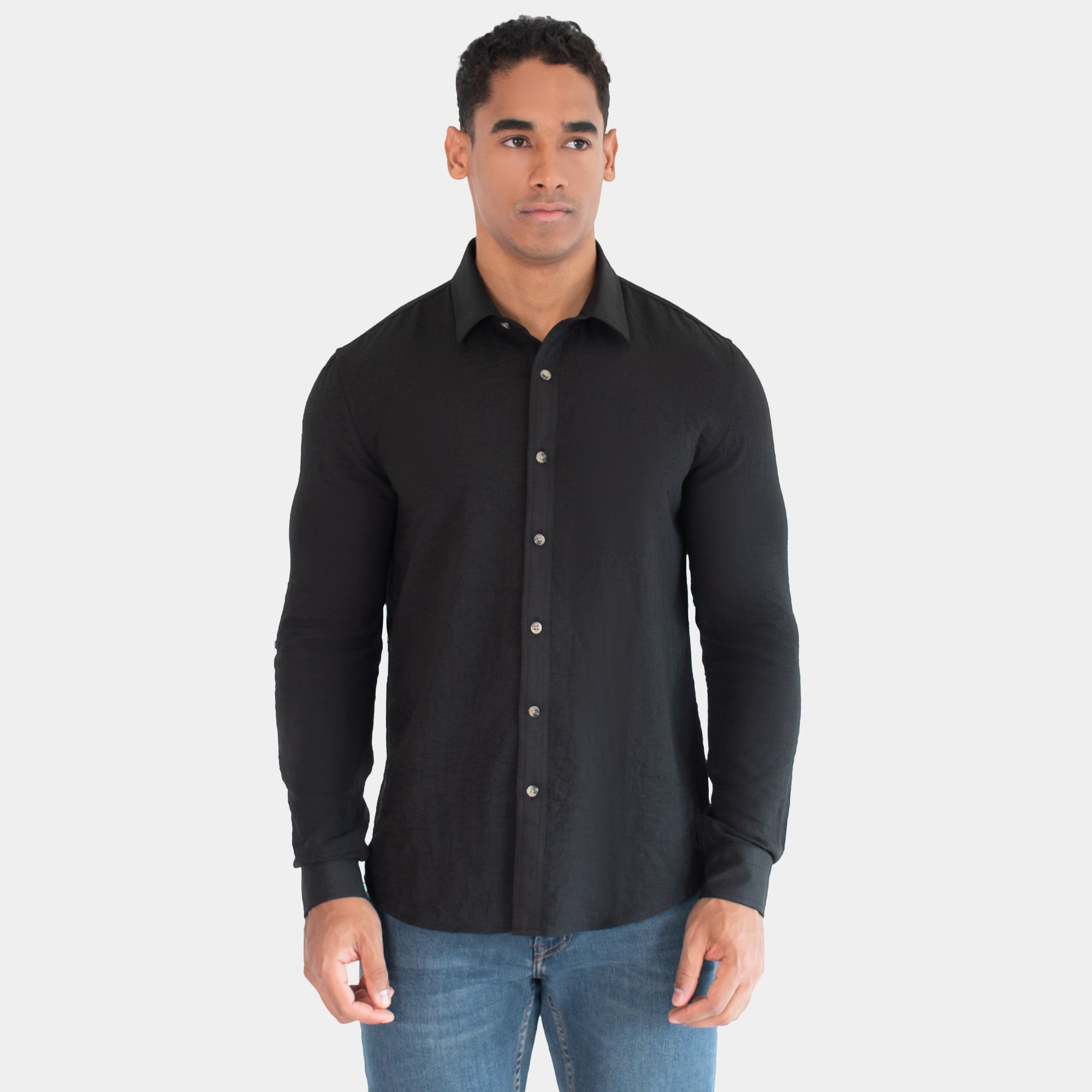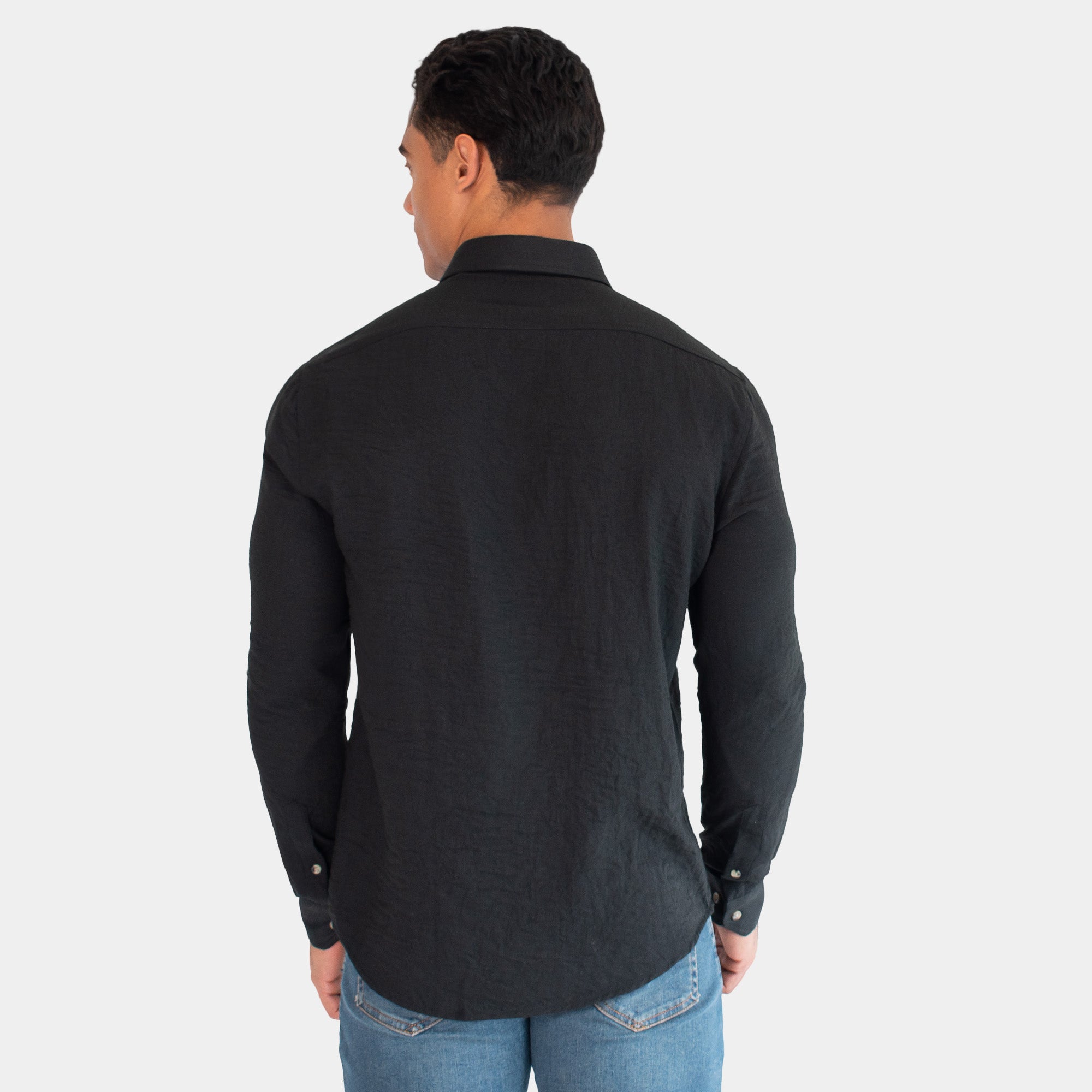 Camisa de manga larga en un tejido vaporoso con apariencia de lino y cuello vuelto. El frente presenta una aletilla con doble pespunte y botones tipo carey que elevan el diseño.